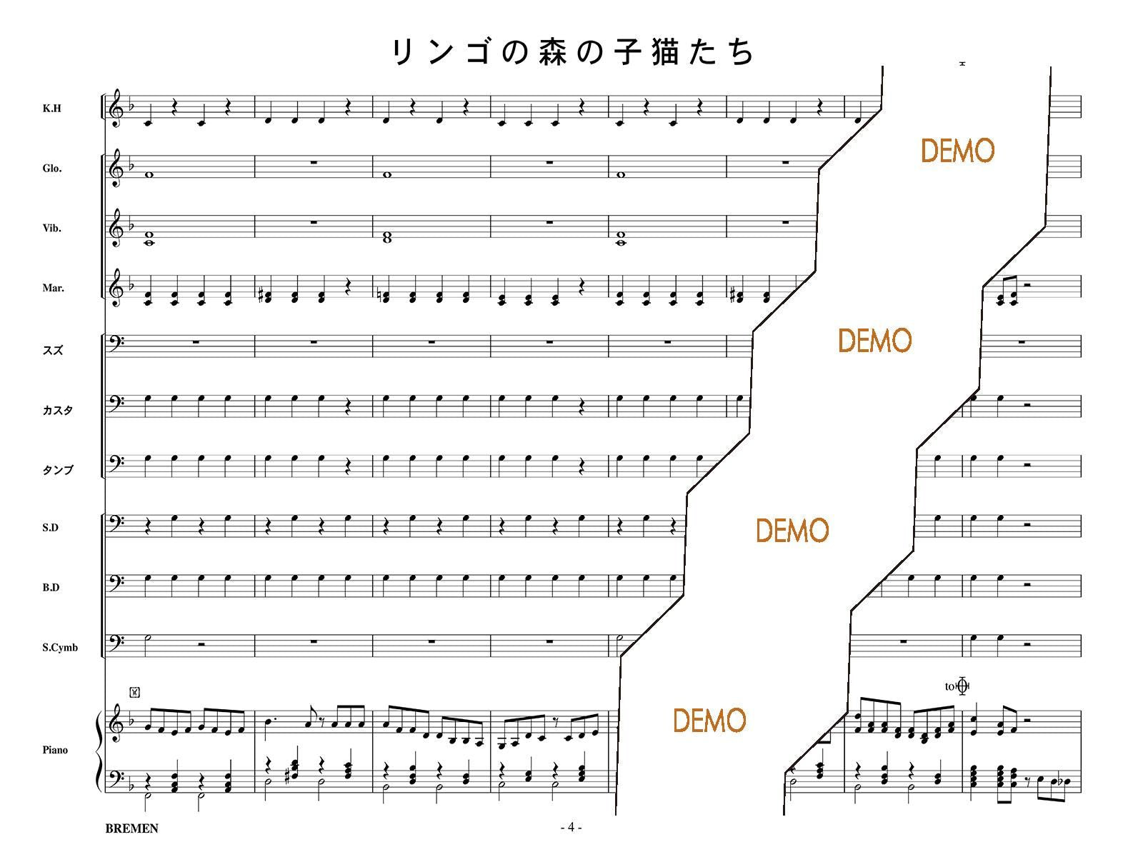 主な使用楽器:鍵盤ハーモニカ、グロッケン、ビブラフォン、マリンバ、スズ、カスタネット、タンバリン、スネアドラム(小太鼓)、バスドラム(大太鼓)、スタンドシンバル、ピアノ