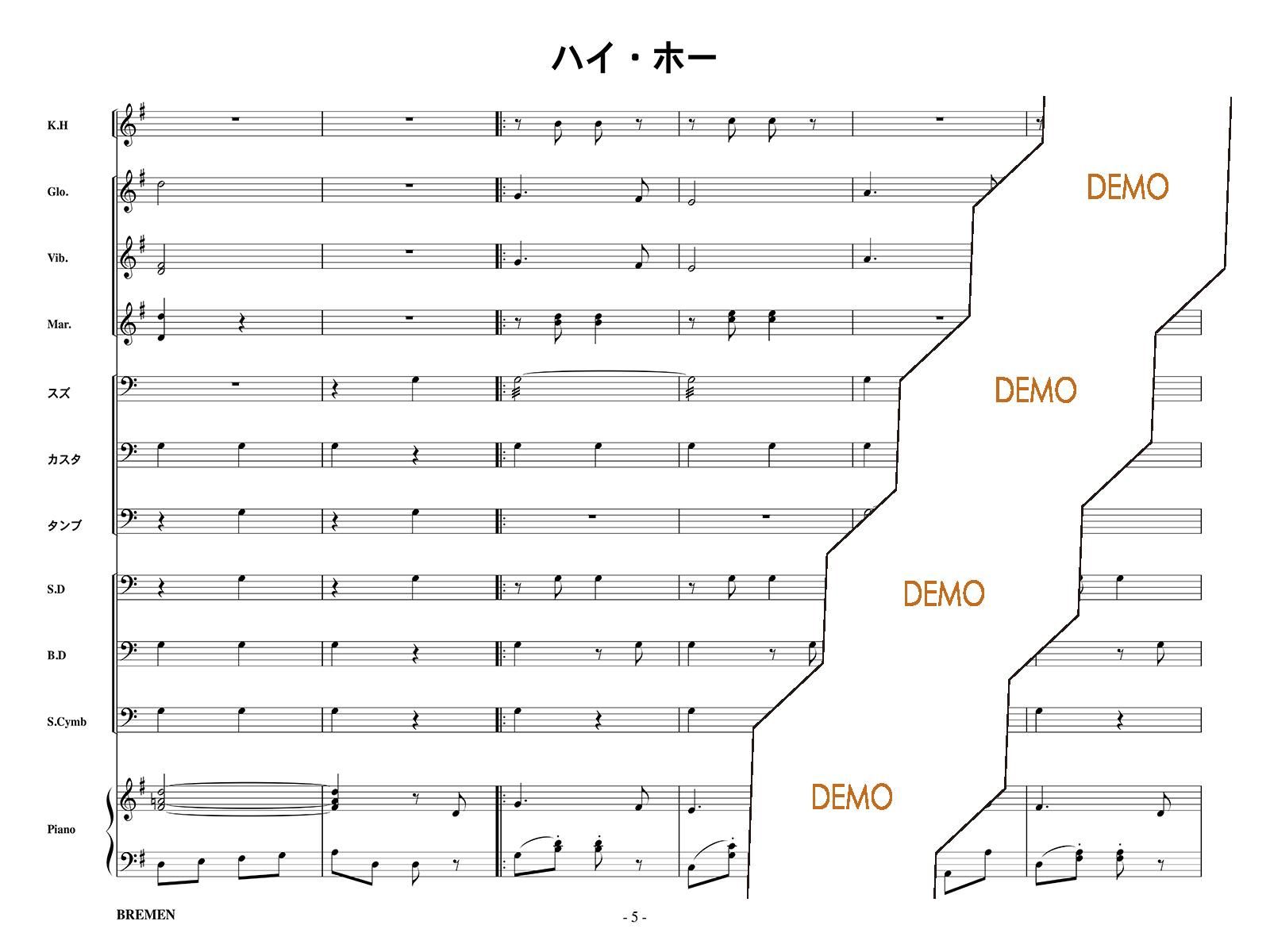 主な使用楽器:鍵盤ハーモニカ、グロッケン、ビブラフォン、マリンバ、スズ、カスタネット、タンバリン、スネアドラム(小太鼓)、バスドラム(大太鼓)、スタンドシンバル、ピアノ