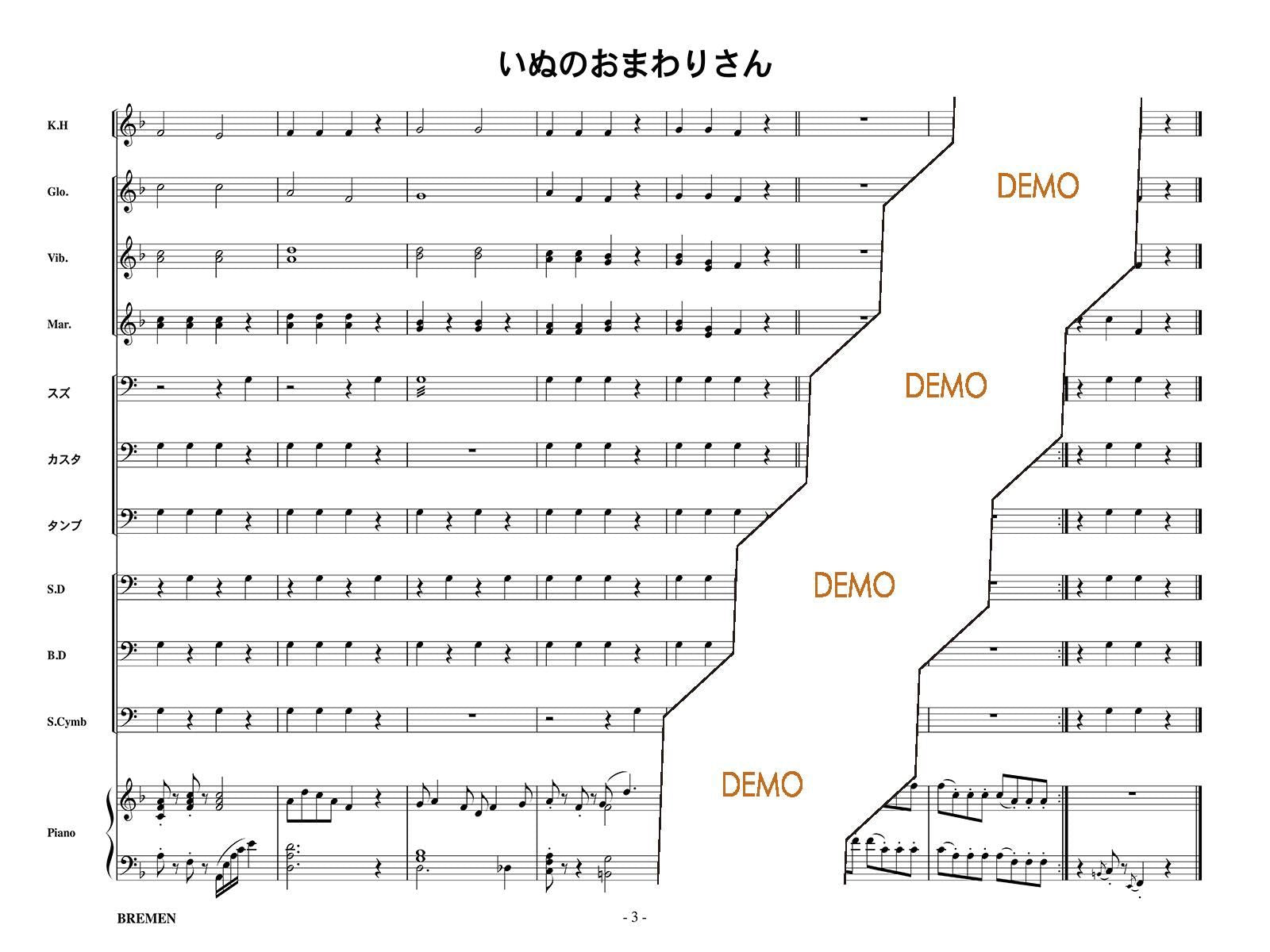 主な使用楽器:鍵盤ハーモニカ、グロッケン、ビブラフォン、マリンバ、スズ、カスタネット、タンバリン、スネアドラム(小太鼓)、バスドラム(大太鼓)、スタンドシンバル、ピアノ