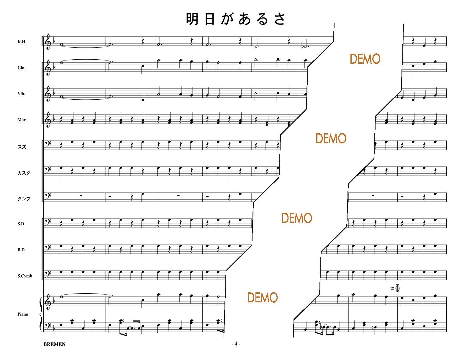 主な使用楽器:鍵盤ハーモニカ、グロッケン、ビブラフォン、マリンバ、スズ、カスタネット、タンバリン、スネアドラム(小太鼓)、バスドラム(大太鼓)、スタンドシンバル、ピアノ