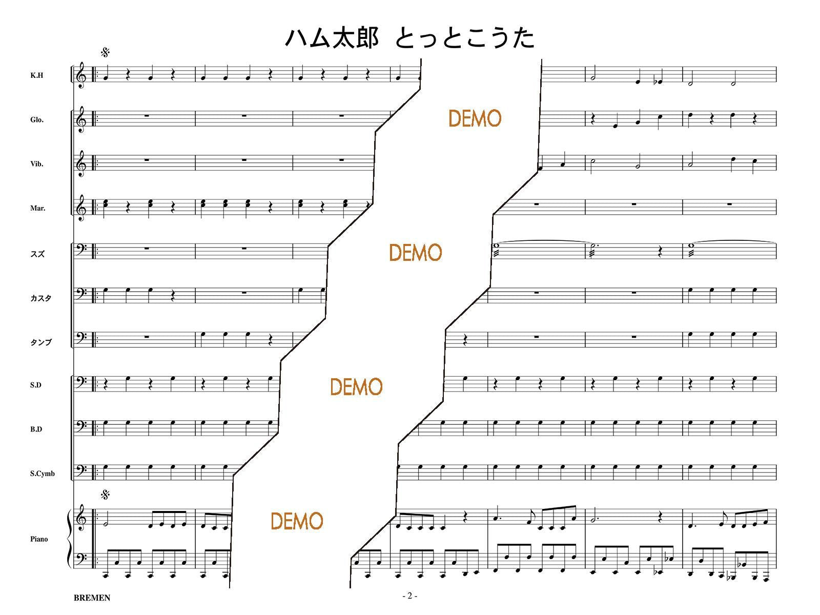 主な使用楽器:鍵盤ハーモニカ、グロッケン、ビブラフォン、マリンバ、スズ、カスタネット、タンバリン、スネアドラム(小太鼓)、バスドラム(大太鼓)、スタンドシンバル、ピアノ