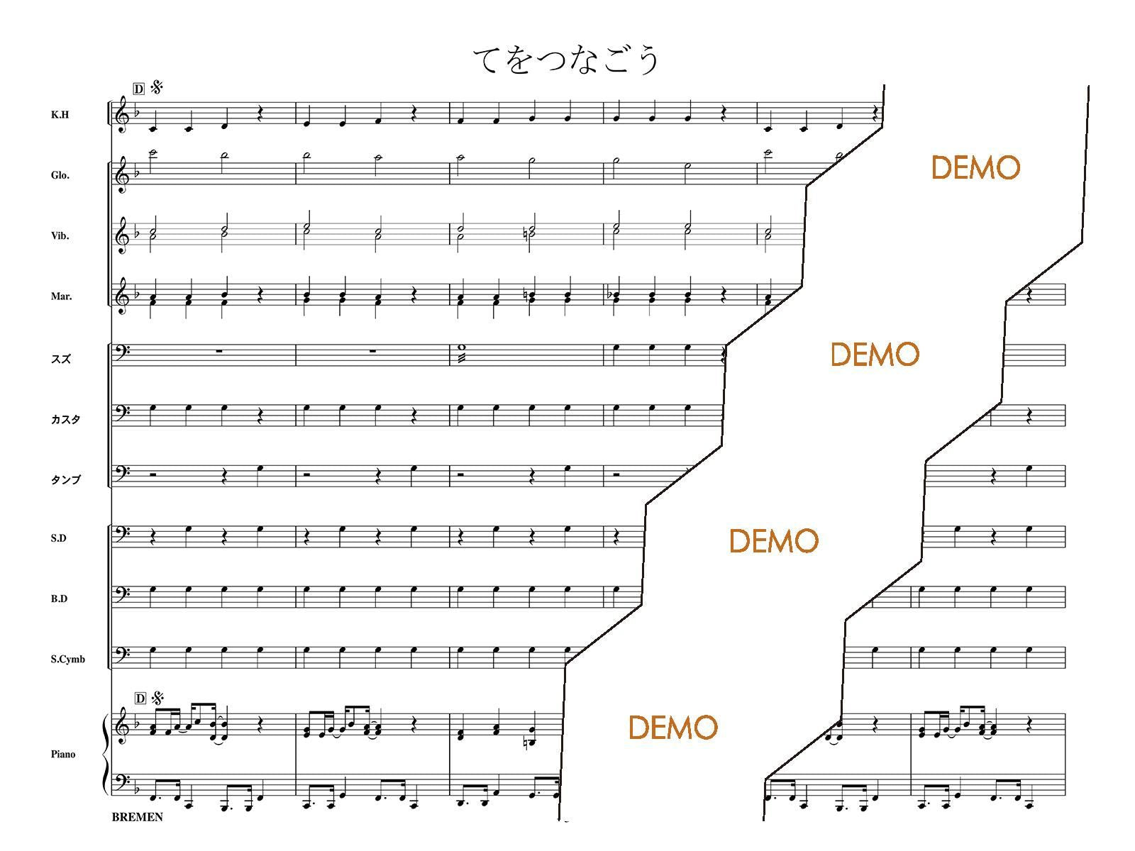 主な使用楽器:鍵盤ハーモニカ、グロッケン、ビブラフォン、マリンバ、スズ、カスタネット、タンバリン、スネアドラム(小太鼓)、バスドラム(大太鼓)、スタンドシンバル、ピアノ