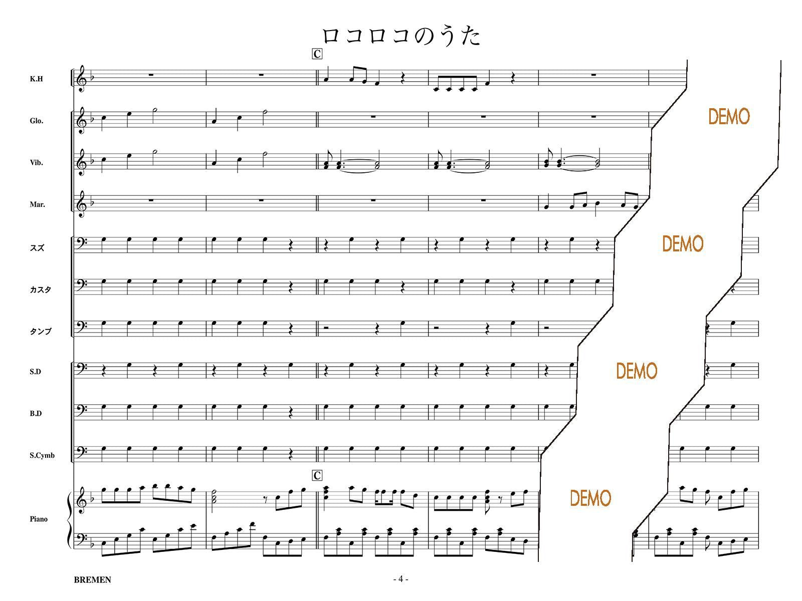 主な使用楽器:鍵盤ハーモニカ、グロッケン、ビブラフォン、マリンバ、スズ、カスタネット、タンバリン、スネアドラム(小太鼓)、バスドラム(大太鼓)、スタンドシンバル、ピアノ