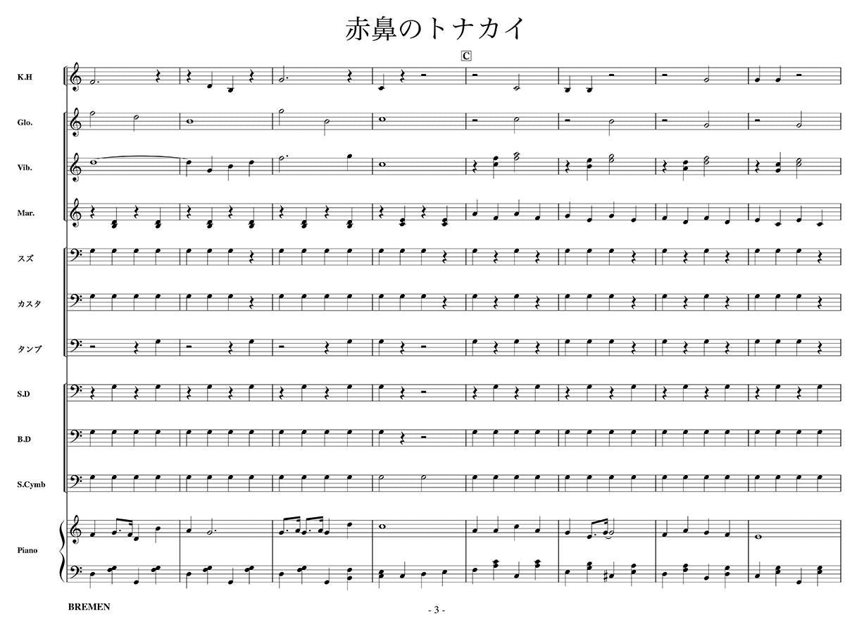 主な使用楽器:鍵盤ハーモニカ、グロッケン、ビブラフォン、マリンバ、スズ、カスタネット、タンバリン、スネアドラム(小太鼓)、バスドラム(大太鼓)、スタンドシンバル、ピアノ
