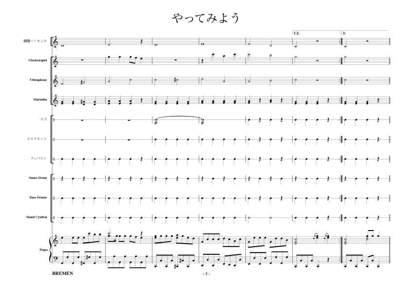 主な使用楽器:鍵盤ハーモニカ、グロッケン、ビブラフォン、マリンバ、スズ、カスタネット、タンバリン、スネアドラム(小太鼓)、バスドラム(大太鼓)、スタンドシンバル、ピアノ
