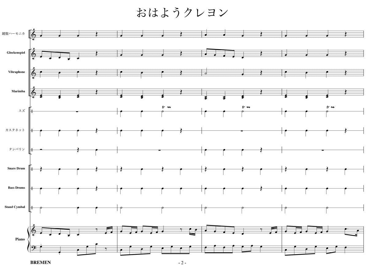 主な使用楽器:鍵盤ハーモニカ、グロッケン、ビブラフォン、マリンバ、スズ、カスタネット、タンバリン、スネアドラム(小太鼓)、バスドラム(大太鼓)、スタンドシンバル、ピアノ