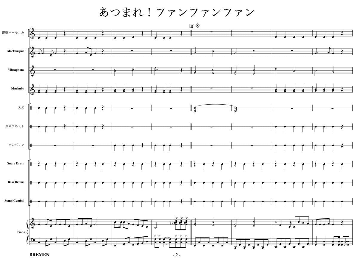 主な使用楽器:鍵盤ハーモニカ、グロッケン、ビブラフォン、マリンバ、スズ、カスタネット、タンバリン、スネアドラム(小太鼓)、バスドラム(大太鼓)、スタンドシンバル、ピアノ