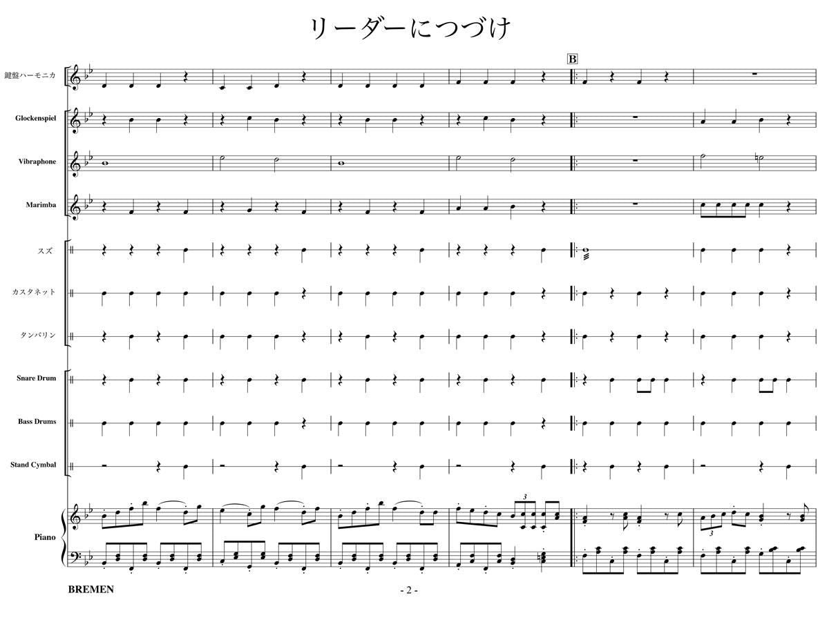 主な使用楽器:鍵盤ハーモニカ、グロッケン、ビブラフォン、マリンバ、スズ、カスタネット、タンバリン、スネアドラム(小太鼓)、バスドラム(大太鼓)、スタンドシンバル、ピアノ
