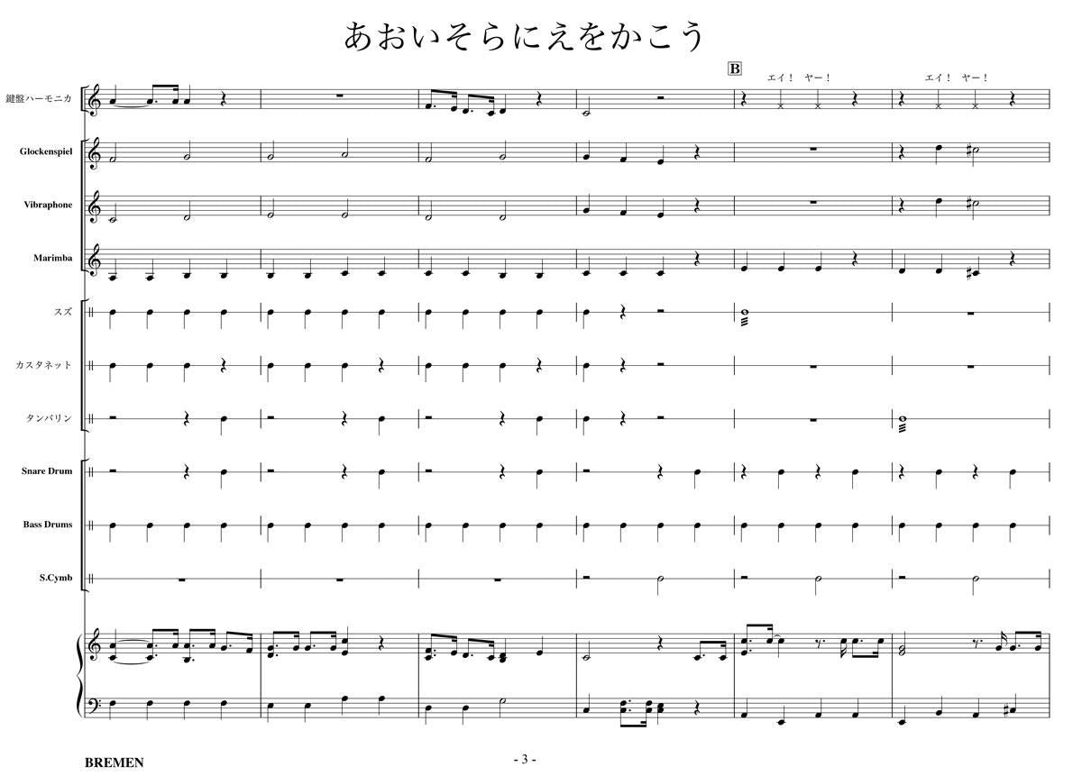 主な使用楽器:鍵盤ハーモニカ、グロッケン、ビブラフォン、マリンバ、スズ、カスタネット、タンバリン、スネアドラム(小太鼓)、バスドラム(大太鼓)、スタンドシンバル、ピアノ