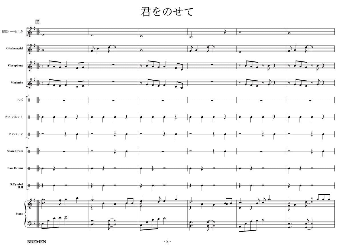 主な使用楽器:鍵盤ハーモニカ、グロッケン、ビブラフォン、マリンバ、スズ、カスタネット、タンバリン、スネアドラム(小太鼓)、バスドラム(大太鼓)、スタンドシンバル、ピアノ