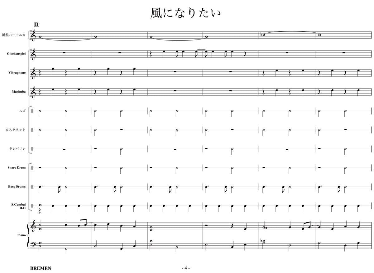 主な使用楽器:鍵盤ハーモニカ、グロッケン、ビブラフォン、マリンバ、スズ、カスタネット、タンバリン、スネアドラム(小太鼓)、バスドラム(大太鼓)、スタンドシンバル、ピアノ