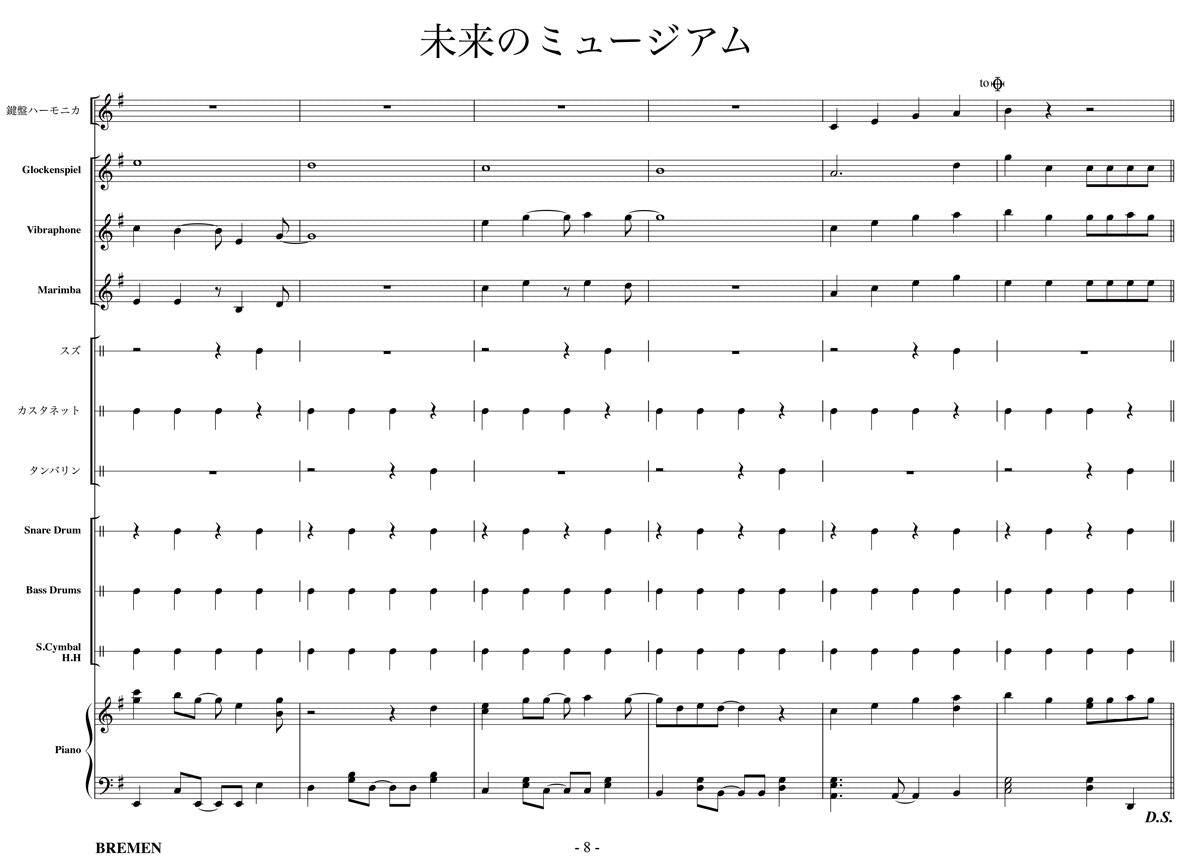 主な使用楽器:鍵盤ハーモニカ、グロッケン、ビブラフォン、マリンバ、スズ、カスタネット、タンバリン、スネアドラム(小太鼓)、バスドラム(大太鼓)、スタンドシンバル、ピアノ