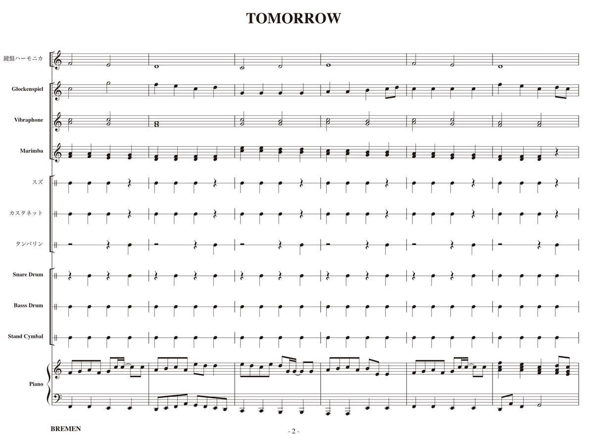 主な使用楽器:鍵盤ハーモニカ、グロッケン、ビブラフォン、マリンバ、スズ、カスタネット、タンバリン、スネアドラム(小太鼓)、バスドラム(大太鼓)、スタンドシンバル、ピアノ