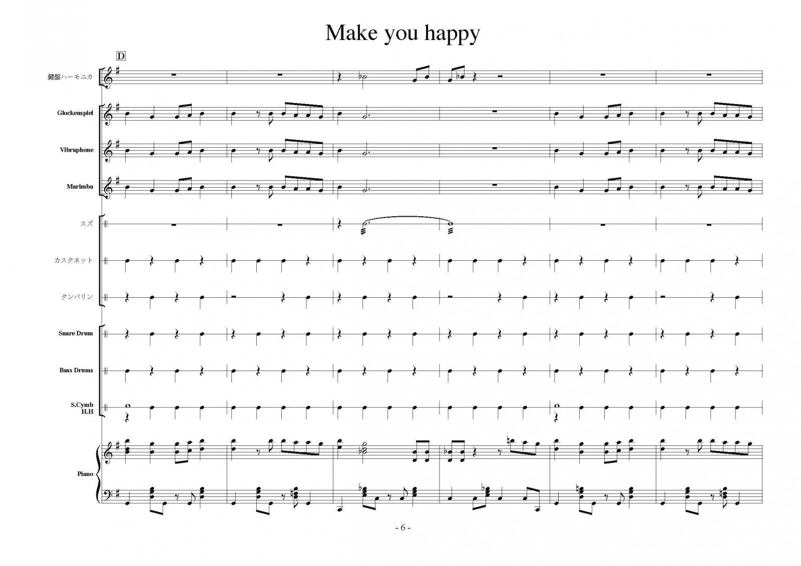 主な使用楽器:鍵盤ハーモニカ、グロッケン、ビブラフォン、マリンバ、スズ、カスタネット、タンバリン、スネアドラム(小太鼓)、バスドラム(大太鼓)、スタンドシンバル、ピアノ
