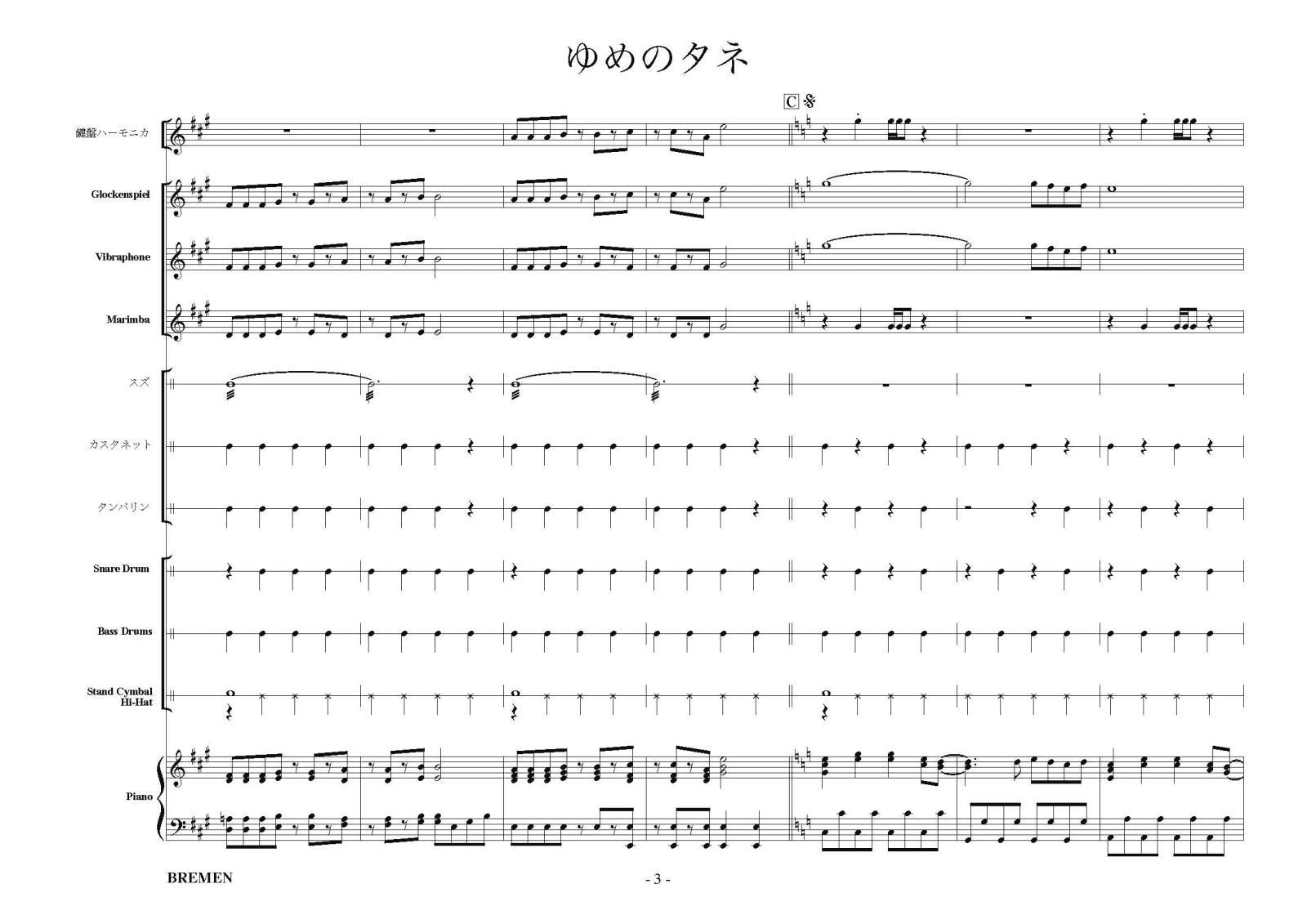 主な使用楽器:鍵盤ハーモニカ、グロッケン、ビブラフォン、マリンバ、スズ、カスタネット、タンバリン、スネアドラム(小太鼓)、バスドラム(大太鼓)、スタンドシンバル、ピアノ