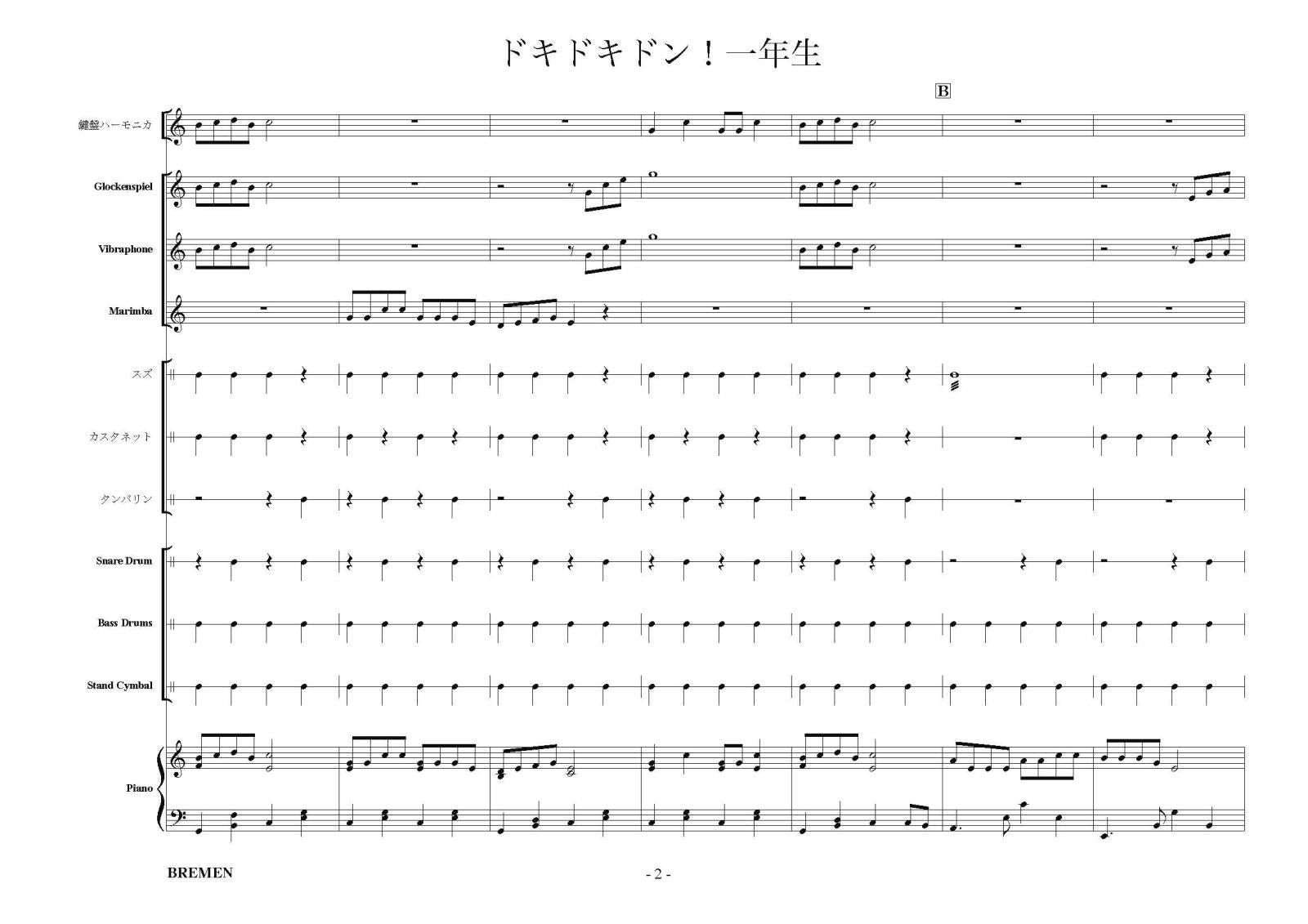 主な使用楽器:鍵盤ハーモニカ、グロッケン、ビブラフォン、マリンバ、スズ、カスタネット、タンバリン、スネアドラム(小太鼓)、バスドラム(大太鼓)、スタンドシンバル、ピアノ