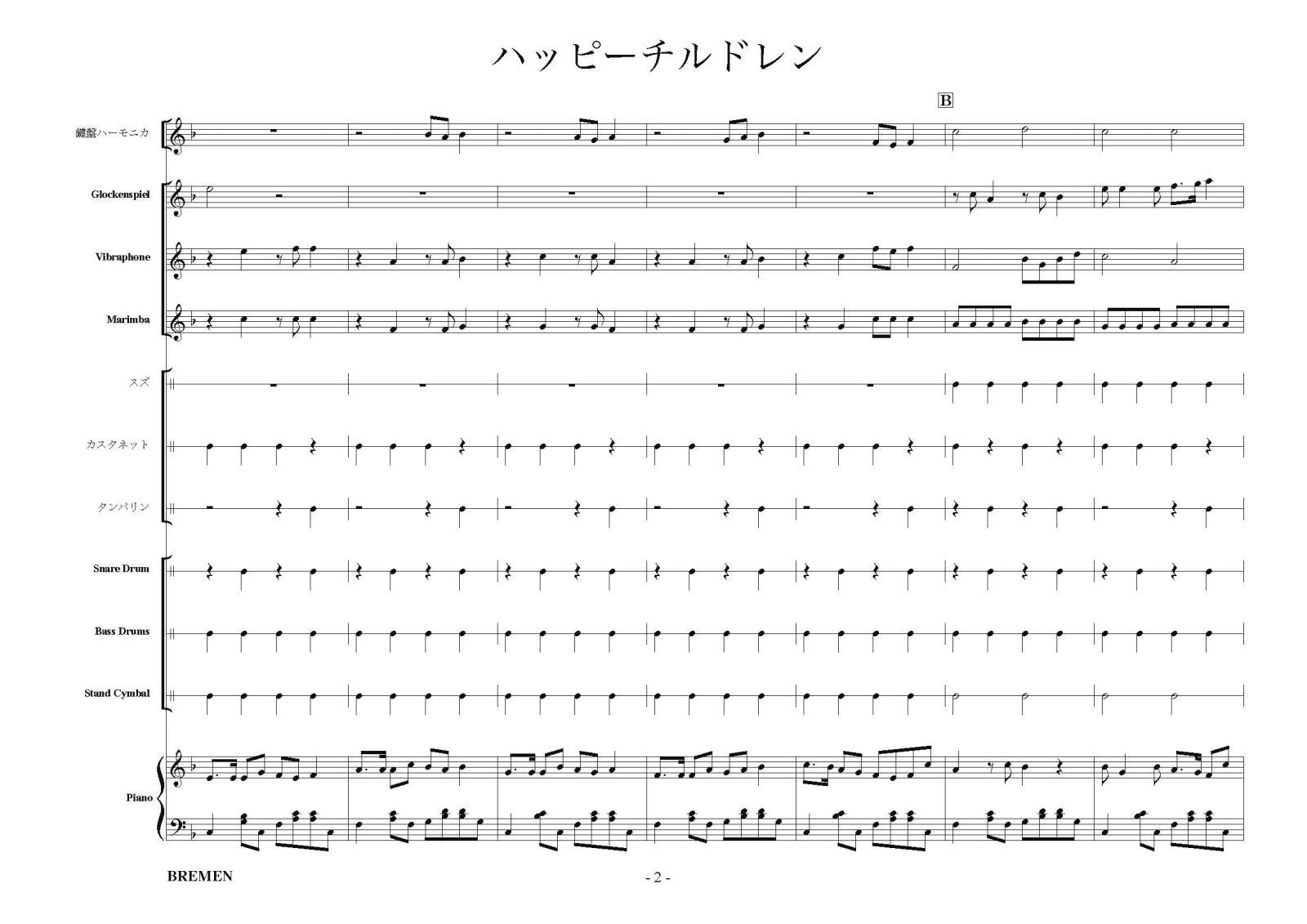 主な使用楽器:鍵盤ハーモニカ、グロッケン、ビブラフォン、マリンバ、スズ、カスタネット、タンバリン、スネアドラム(小太鼓)、バスドラム(大太鼓)、スタンドシンバル、ピアノ