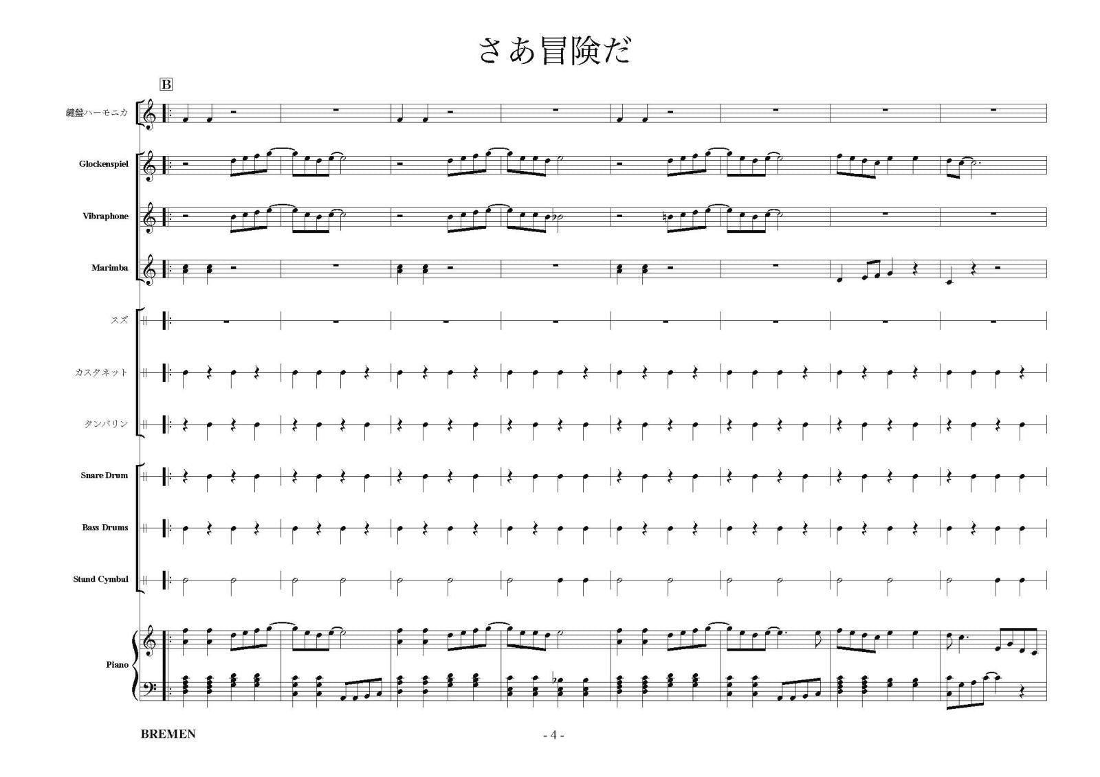主な使用楽器:鍵盤ハーモニカ、グロッケン、ビブラフォン、マリンバ、スズ、カスタネット、タンバリン、スネアドラム(小太鼓)、バスドラム(大太鼓)、スタンドシンバル、ピアノ