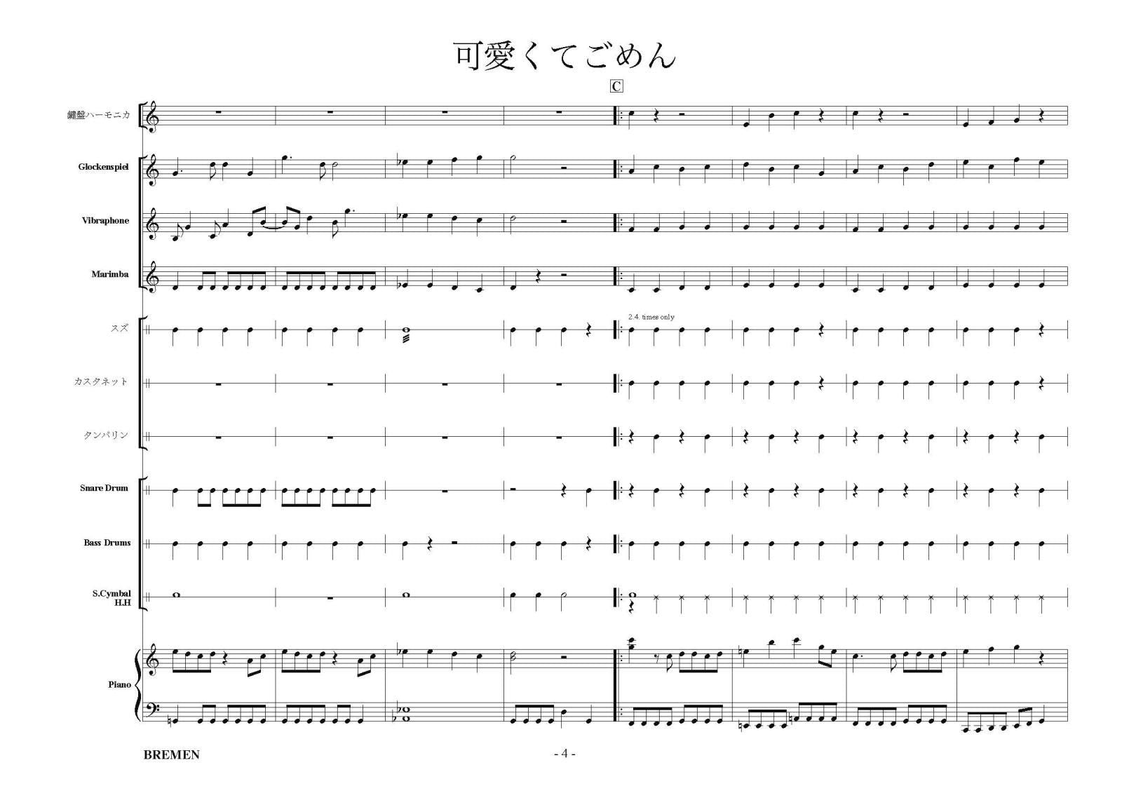 主な使用楽器:鍵盤ハーモニカ、グロッケン、ビブラフォン、マリンバ、スズ、カスタネット、タンバリン、スネアドラム(小太鼓)、バスドラム(大太鼓)、スタンドシンバル、ピアノ