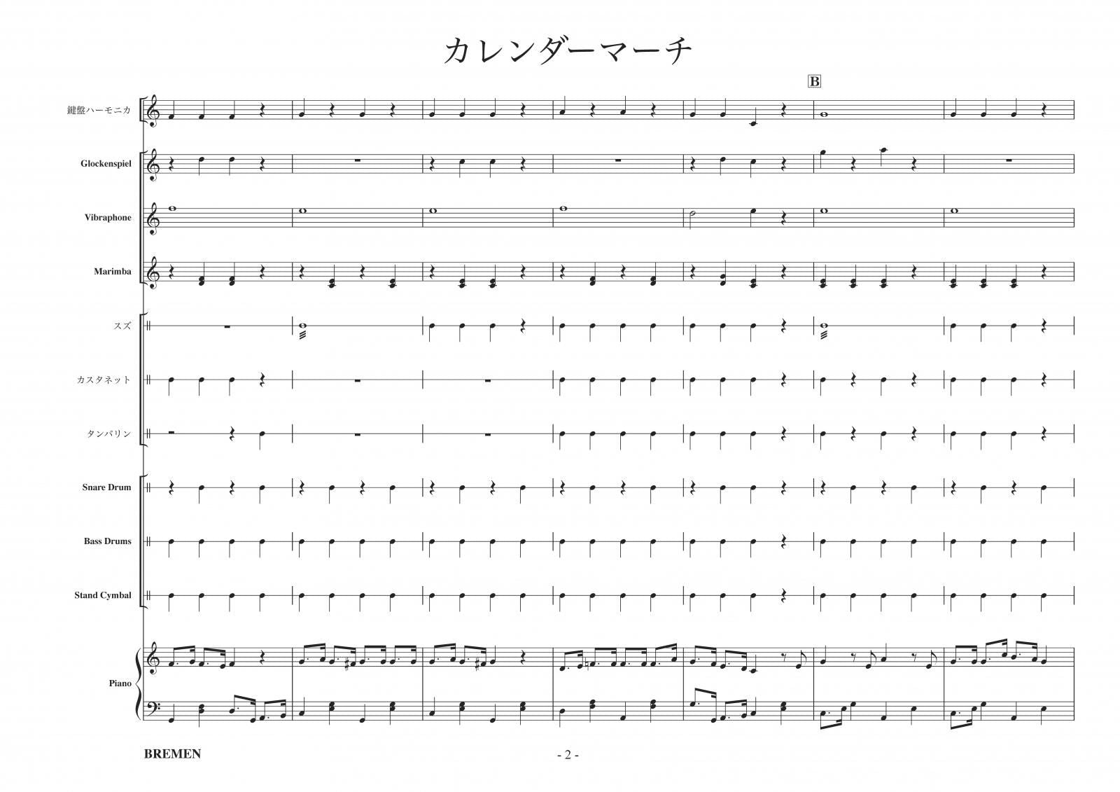 主な使用楽器:鍵盤ハーモニカ、グロッケン、ビブラフォン、マリンバ、スズ、カスタネット、タンバリン、スネアドラム(小太鼓)、バスドラム(大太鼓)、スタンドシンバル、ピアノ