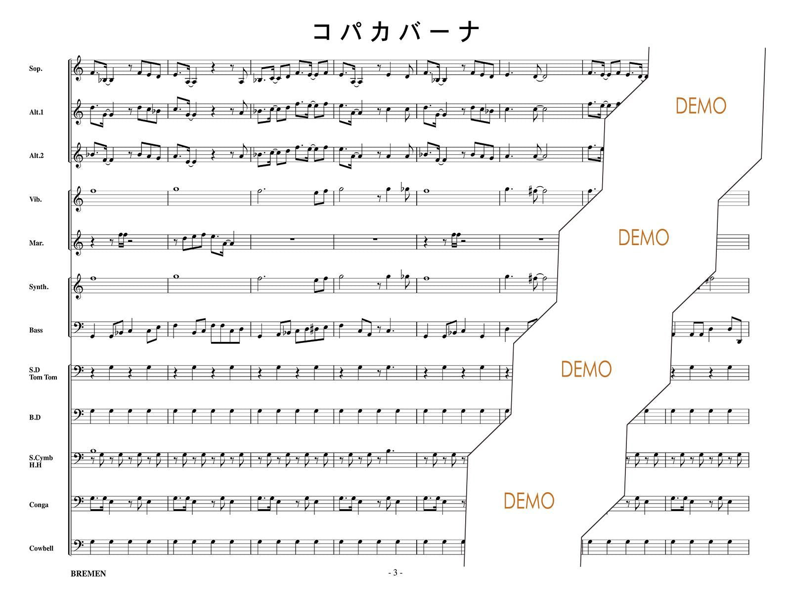 主な使用楽器:鍵盤ハーモニカ、グロッケン(鉄琴)、ビブラフォーン(鉄琴)、マリンバ(木琴)、シンセサイザー(電子オルガン)、ベース(低音楽器)、スネアドラム(小太鼓)、バスドラム(大太鼓)、パーカッション、ティンパニー等