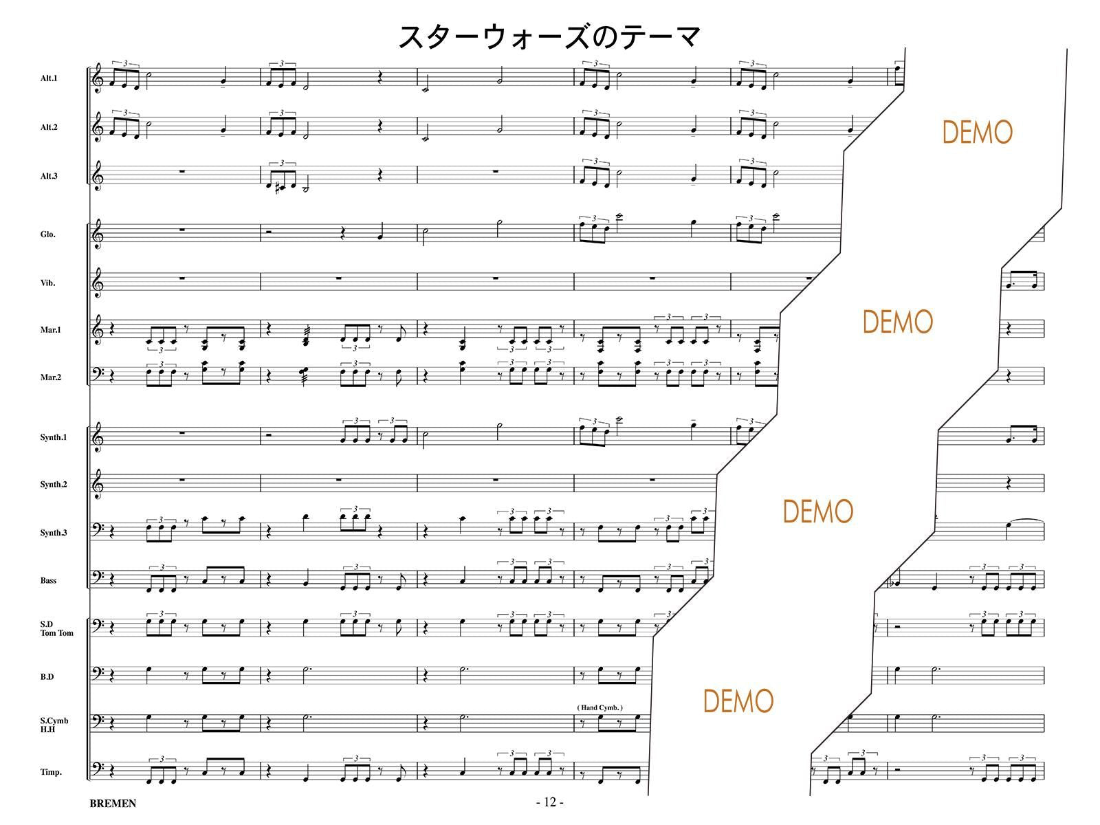 主な使用楽器:鍵盤ハーモニカ、グロッケン(鉄琴)、ビブラフォーン(鉄琴)、マリンバ(木琴)、シンセサイザー(電子オルガン)、ベース(低音楽器)、スネアドラム(小太鼓)、バスドラム(大太鼓)、パーカッション、ティンパニー等