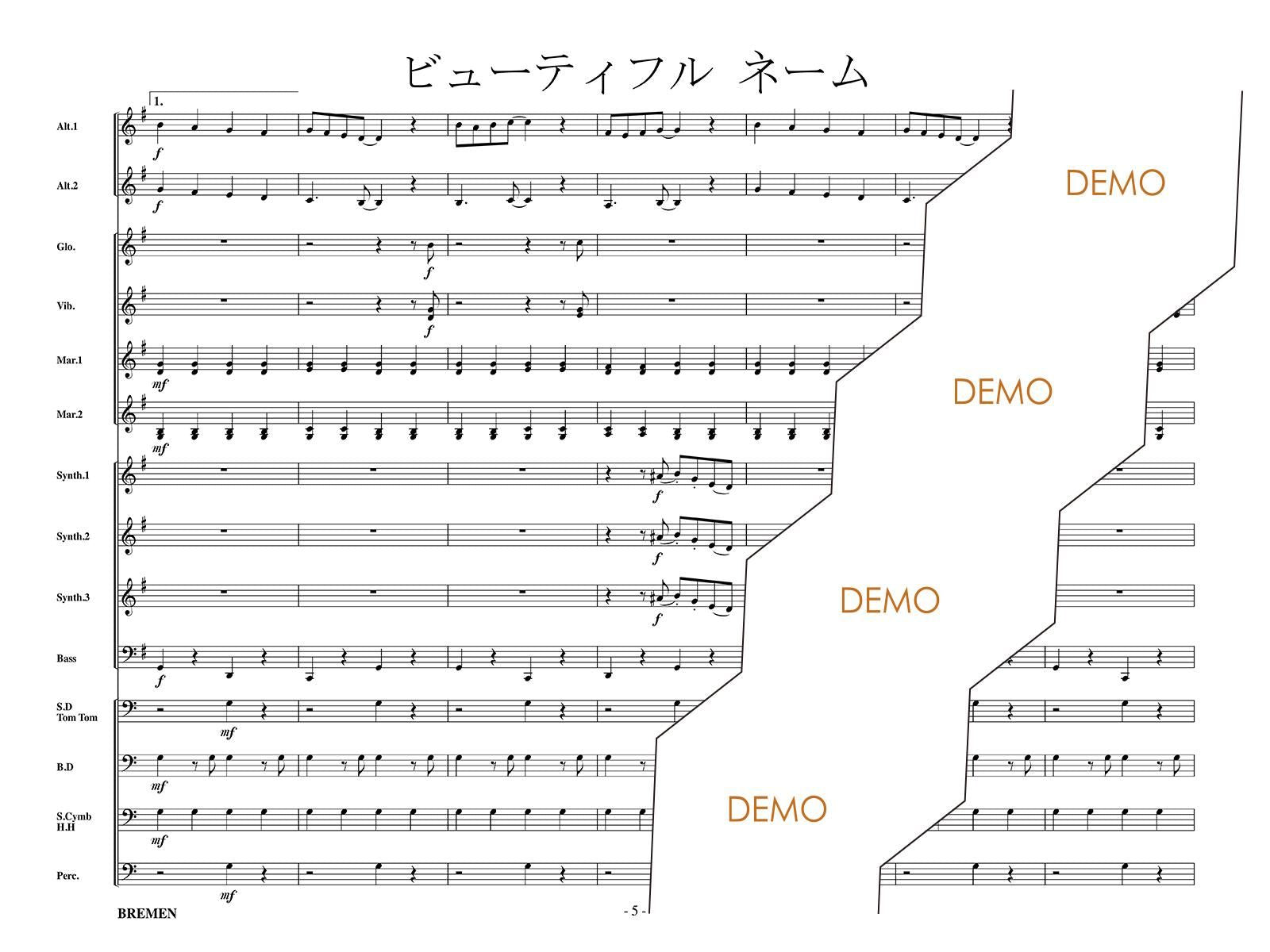 主な使用楽器:鍵盤ハーモニカ、グロッケン(鉄琴)、ビブラフォーン(鉄琴)、マリンバ(木琴)、シンセサイザー(電子オルガン)、ベース(低音楽器)、スネアドラム(小太鼓)、バスドラム(大太鼓)、パーカッション、ティンパニー等