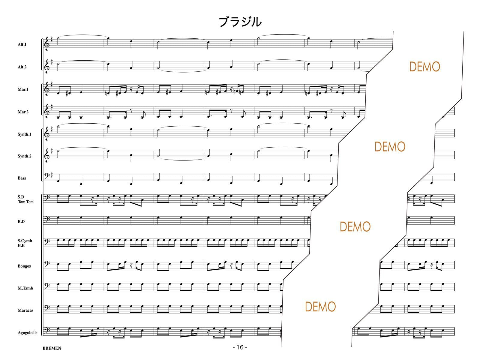 主な使用楽器:鍵盤ハーモニカ、グロッケン(鉄琴)、ビブラフォーン(鉄琴)、マリンバ(木琴)、シンセサイザー(電子オルガン)、ベース(低音楽器)、スネアドラム(小太鼓)、バスドラム(大太鼓)、パーカッション、ティンパニー等