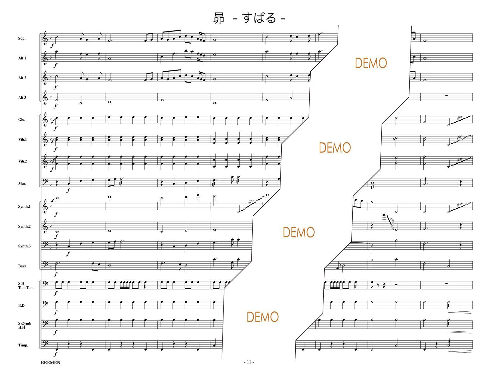 主な使用楽器:鍵盤ハーモニカ、グロッケン(鉄琴)、ビブラフォーン(鉄琴)、マリンバ(木琴)、シンセサイザー(電子オルガン)、ベース(低音楽器)、スネアドラム(小太鼓)、バスドラム(大太鼓)、パーカッション、ティンパニー等