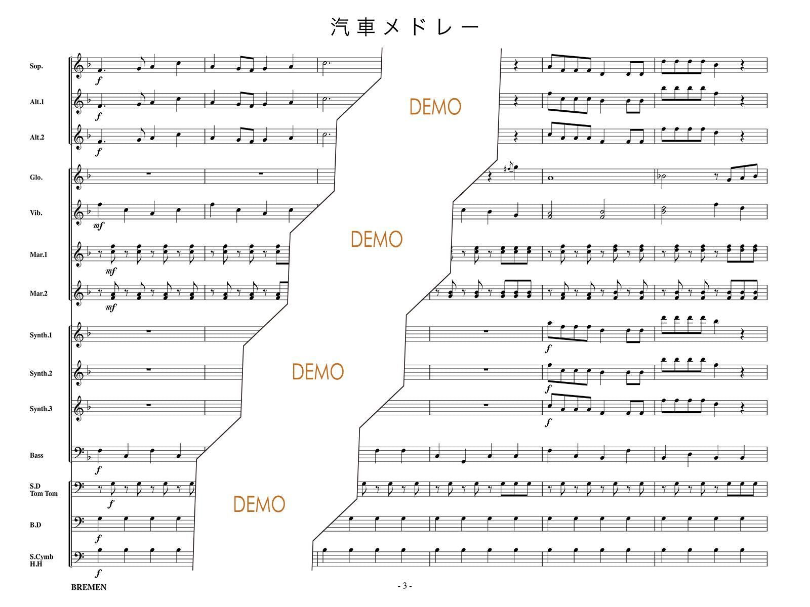 主な使用楽器:鍵盤ハーモニカ、グロッケン(鉄琴)、ビブラフォーン(鉄琴)、マリンバ(木琴)、シンセサイザー(電子オルガン)、ベース(低音楽器)、スネアドラム(小太鼓)、バスドラム(大太鼓)、パーカッション、ティンパニー等