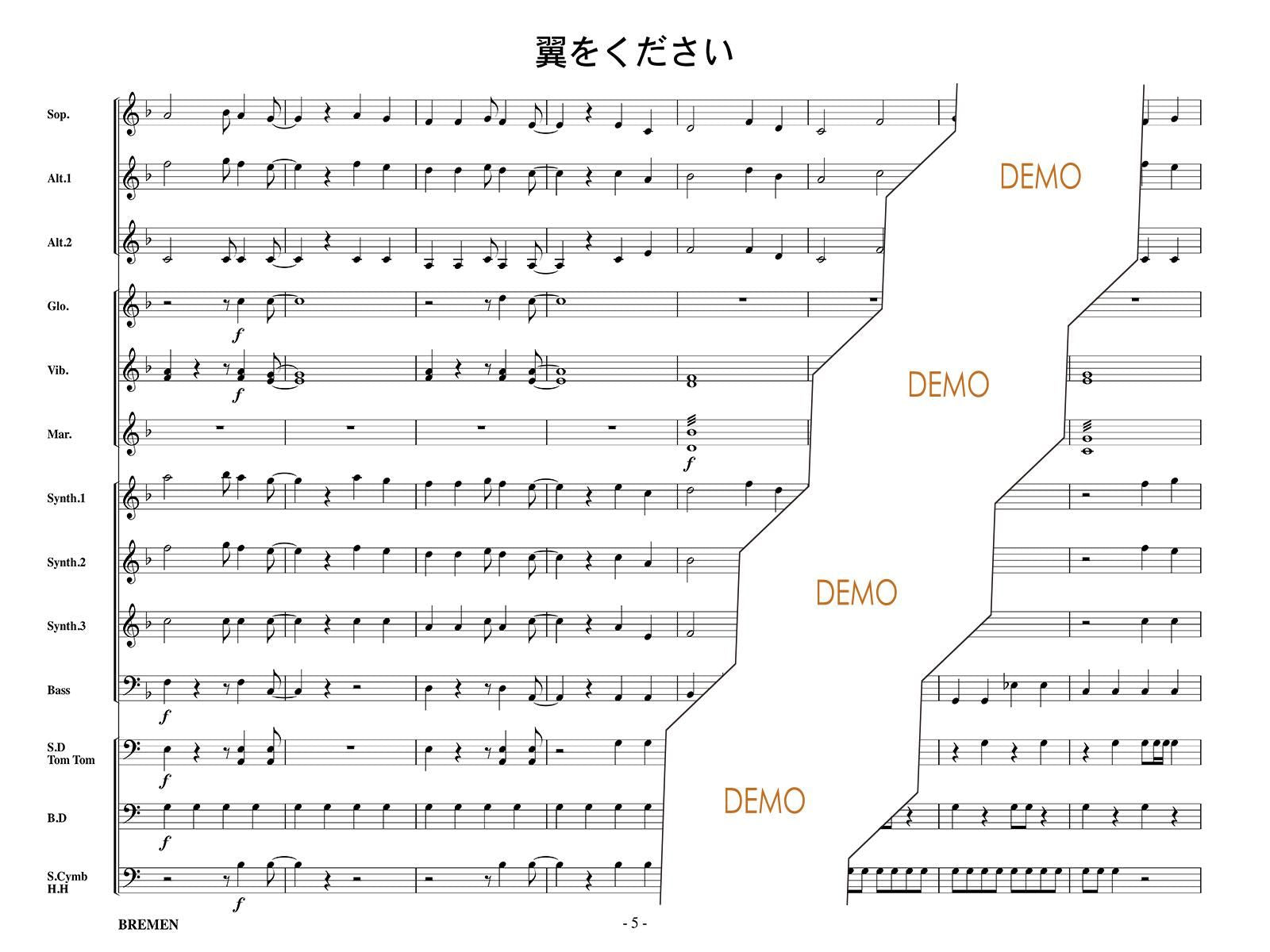 主な使用楽器:鍵盤ハーモニカ、グロッケン(鉄琴)、ビブラフォーン(鉄琴)、マリンバ(木琴)、シンセサイザー(電子オルガン)、ベース(低音楽器)、スネアドラム(小太鼓)、バスドラム(大太鼓)、パーカッション、ティンパニー等
