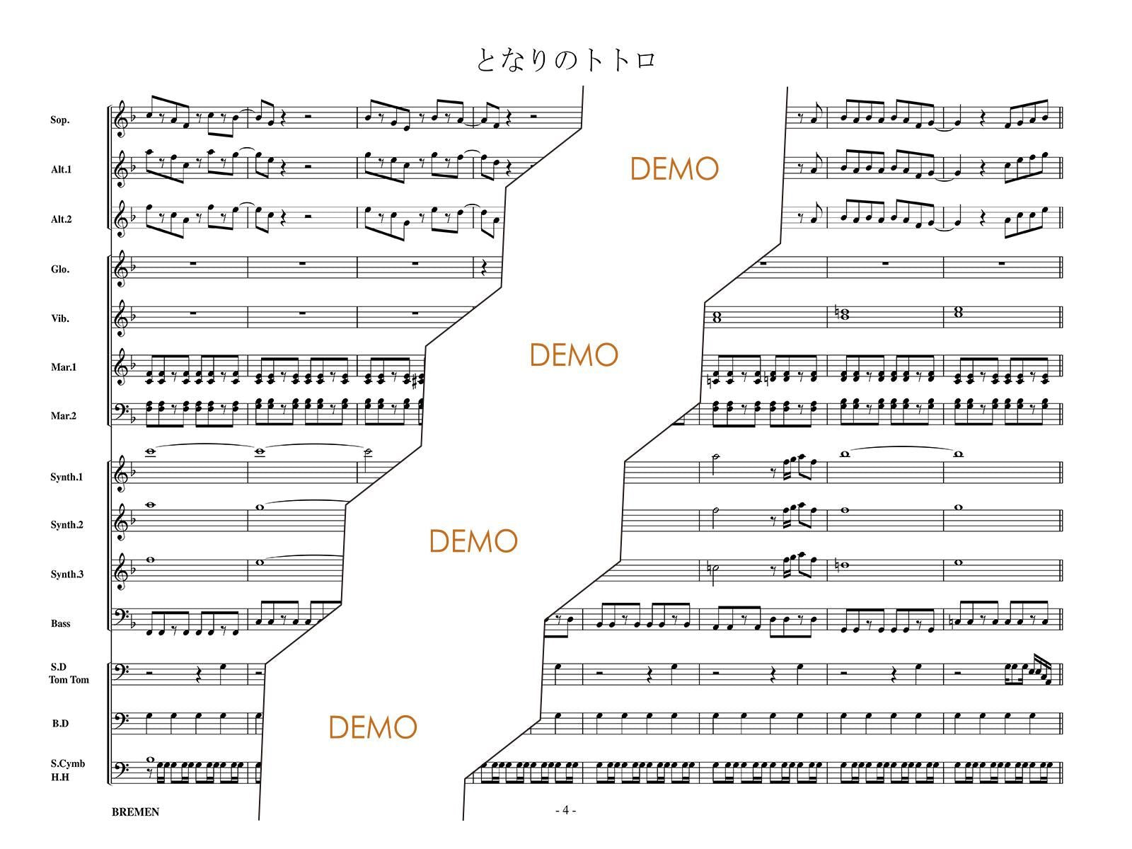 主な使用楽器:鍵盤ハーモニカ、グロッケン(鉄琴)、ビブラフォーン(鉄琴)、マリンバ(木琴)、シンセサイザー(電子オルガン)、ベース(低音楽器)、スネアドラム(小太鼓)、バスドラム(大太鼓)、パーカッション、ティンパニー等