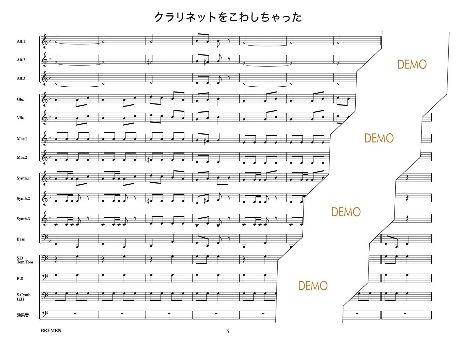主な使用楽器:鍵盤ハーモニカ、グロッケン(鉄琴)、ビブラフォーン(鉄琴)、マリンバ(木琴)、シンセサイザー(電子オルガン)、ベース(低音楽器)、スネアドラム(小太鼓)、バスドラム(大太鼓)、パーカッション、ティンパニー等