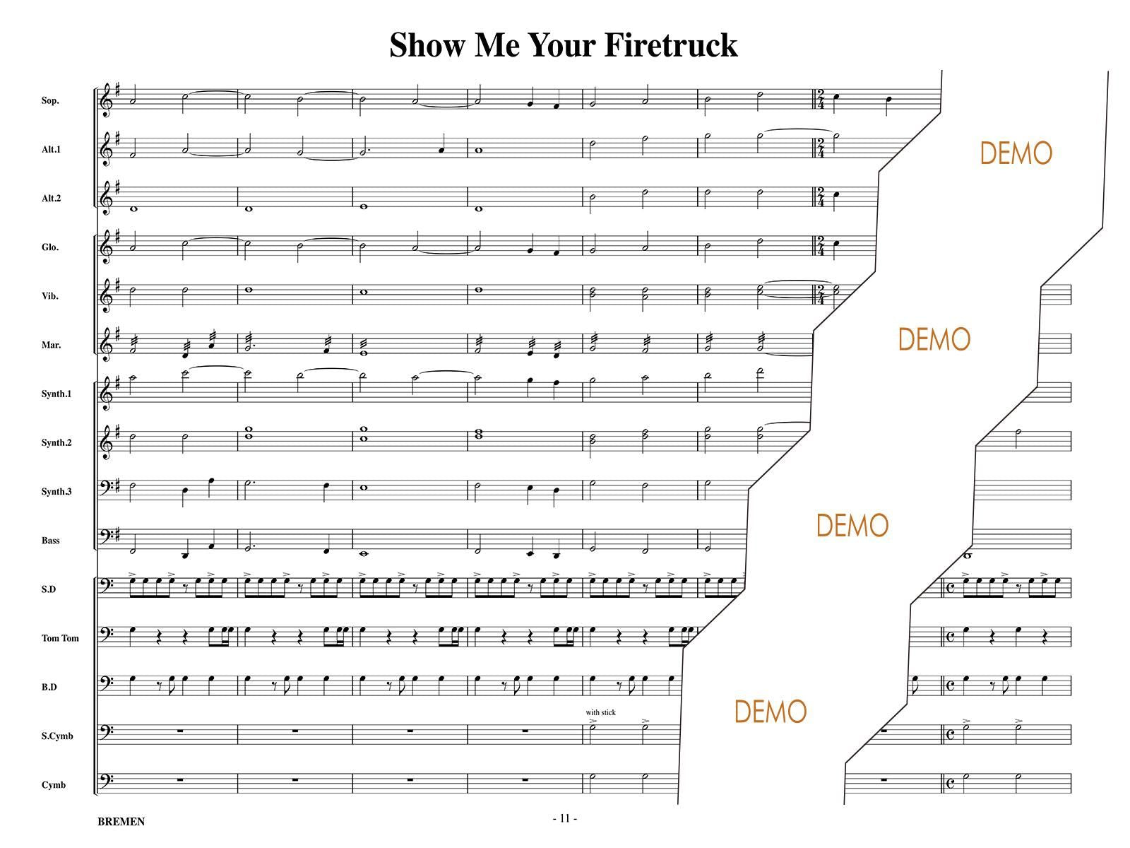 主な使用楽器:鍵盤ハーモニカ、グロッケン(鉄琴)、ビブラフォーン(鉄琴)、マリンバ(木琴)、シンセサイザー(電子オルガン)、ベース(低音楽器)、スネアドラム(小太鼓)、バスドラム(大太鼓)、パーカッション、ティンパニー等