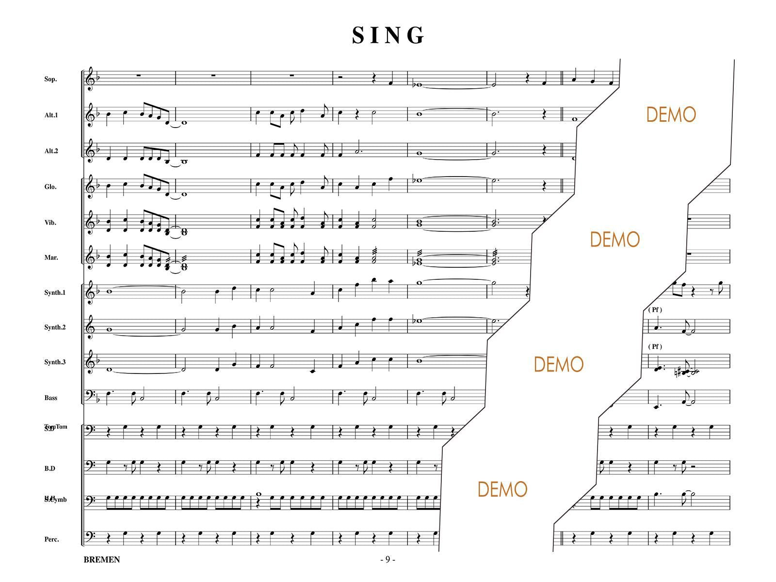 主な使用楽器:鍵盤ハーモニカ、グロッケン(鉄琴)、ビブラフォーン(鉄琴)、マリンバ(木琴)、シンセサイザー(電子オルガン)、ベース(低音楽器)、スネアドラム(小太鼓)、バスドラム(大太鼓)、パーカッション、ティンパニー等