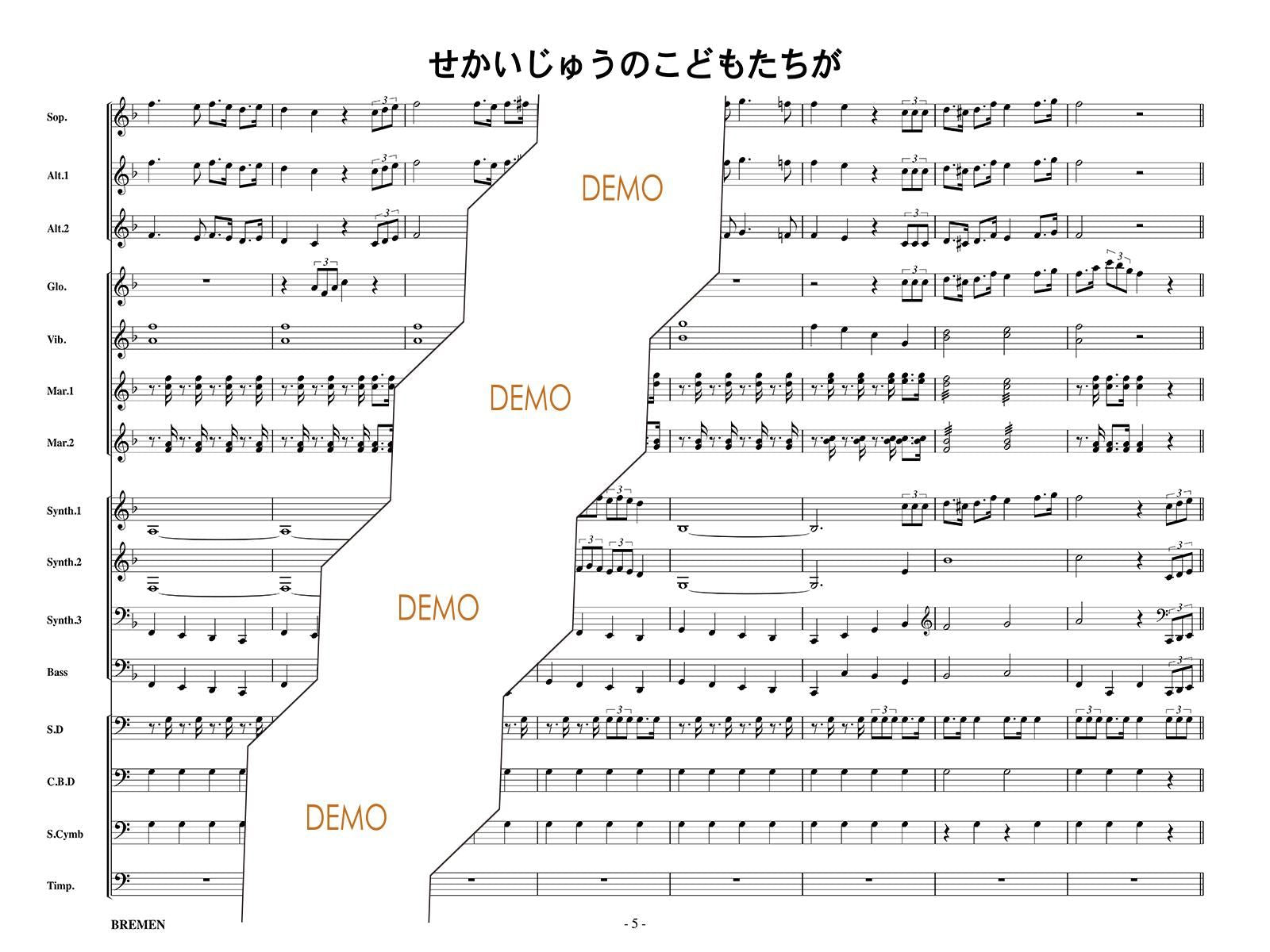主な使用楽器:鍵盤ハーモニカ、グロッケン(鉄琴)、ビブラフォーン(鉄琴)、マリンバ(木琴)、シンセサイザー(電子オルガン)、ベース(低音楽器)、スネアドラム(小太鼓)、バスドラム(大太鼓)、パーカッション、ティンパニー等