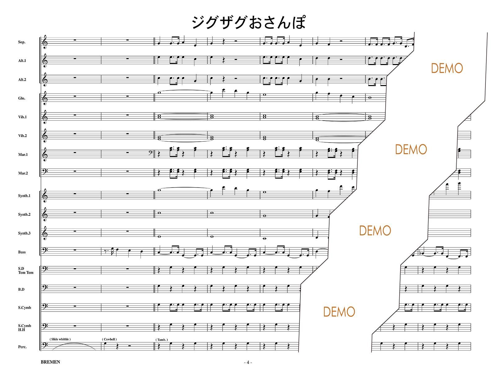主な使用楽器:鍵盤ハーモニカ、グロッケン(鉄琴)、ビブラフォーン(鉄琴)、マリンバ(木琴)、シンセサイザー(電子オルガン)、ベース(低音楽器)、スネアドラム(小太鼓)、バスドラム(大太鼓)、パーカッション、ティンパニー等