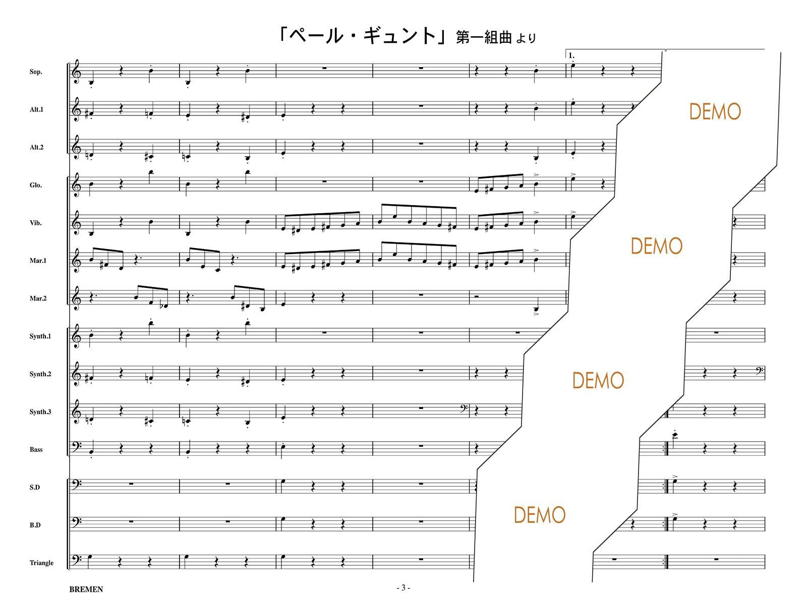 主な使用楽器:鍵盤ハーモニカ、グロッケン(鉄琴)、ビブラフォーン(鉄琴)、マリンバ(木琴)、シンセサイザー(電子オルガン)、ベース(低音楽器)、スネアドラム(小太鼓)、バスドラム(大太鼓)、パーカッション、ティンパニー等