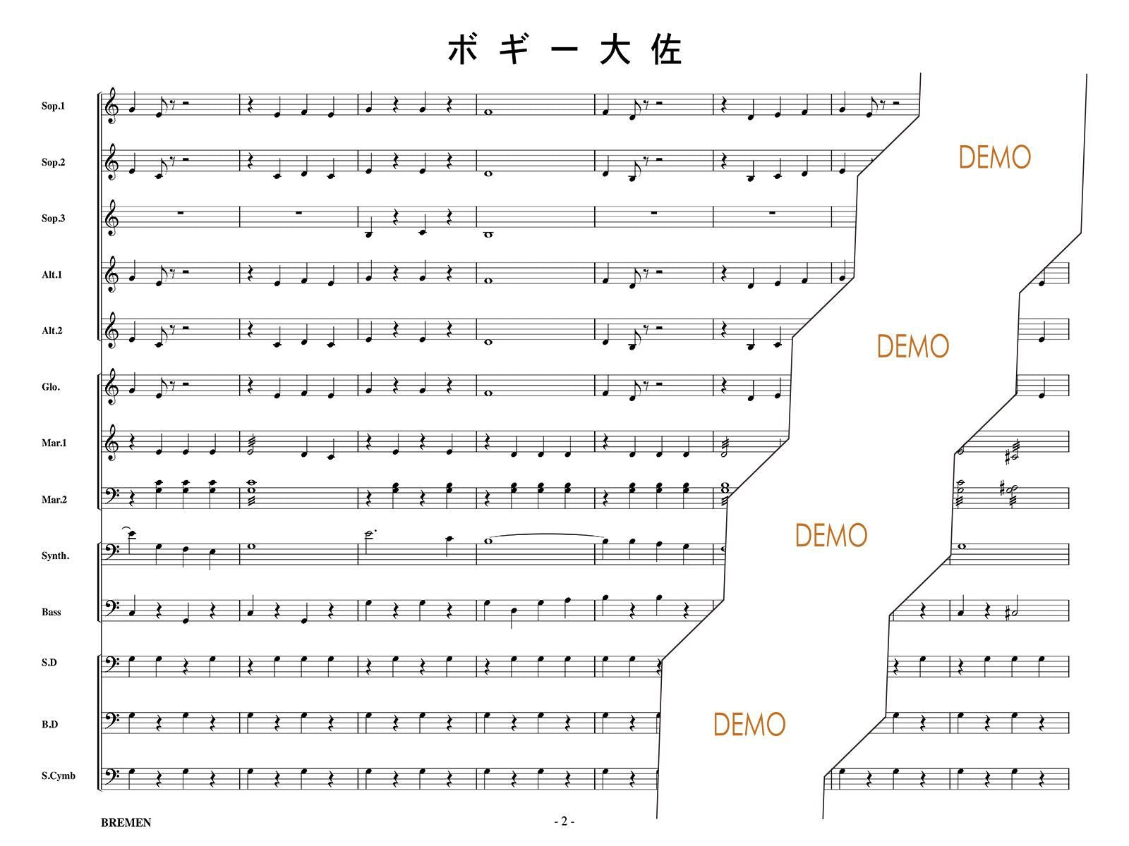 主な使用楽器:鍵盤ハーモニカ、グロッケン(鉄琴)、ビブラフォーン(鉄琴)、マリンバ(木琴)、シンセサイザー(電子オルガン)、ベース(低音楽器)、スネアドラム(小太鼓)、バスドラム(大太鼓)、パーカッション、ティンパニー等