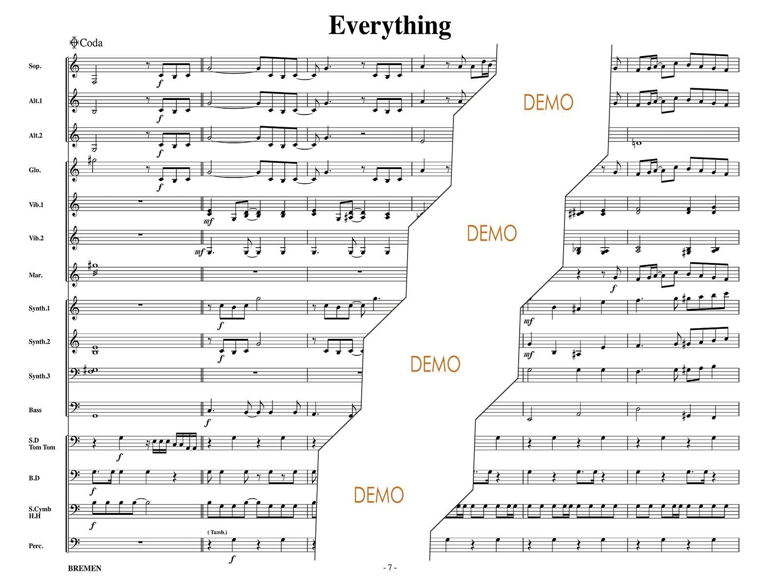 主な使用楽器:鍵盤ハーモニカ、グロッケン(鉄琴)、ビブラフォーン(鉄琴)、マリンバ(木琴)、シンセサイザー(電子オルガン)、ベース(低音楽器)、スネアドラム(小太鼓)、バスドラム(大太鼓)、パーカッション、ティンパニー等