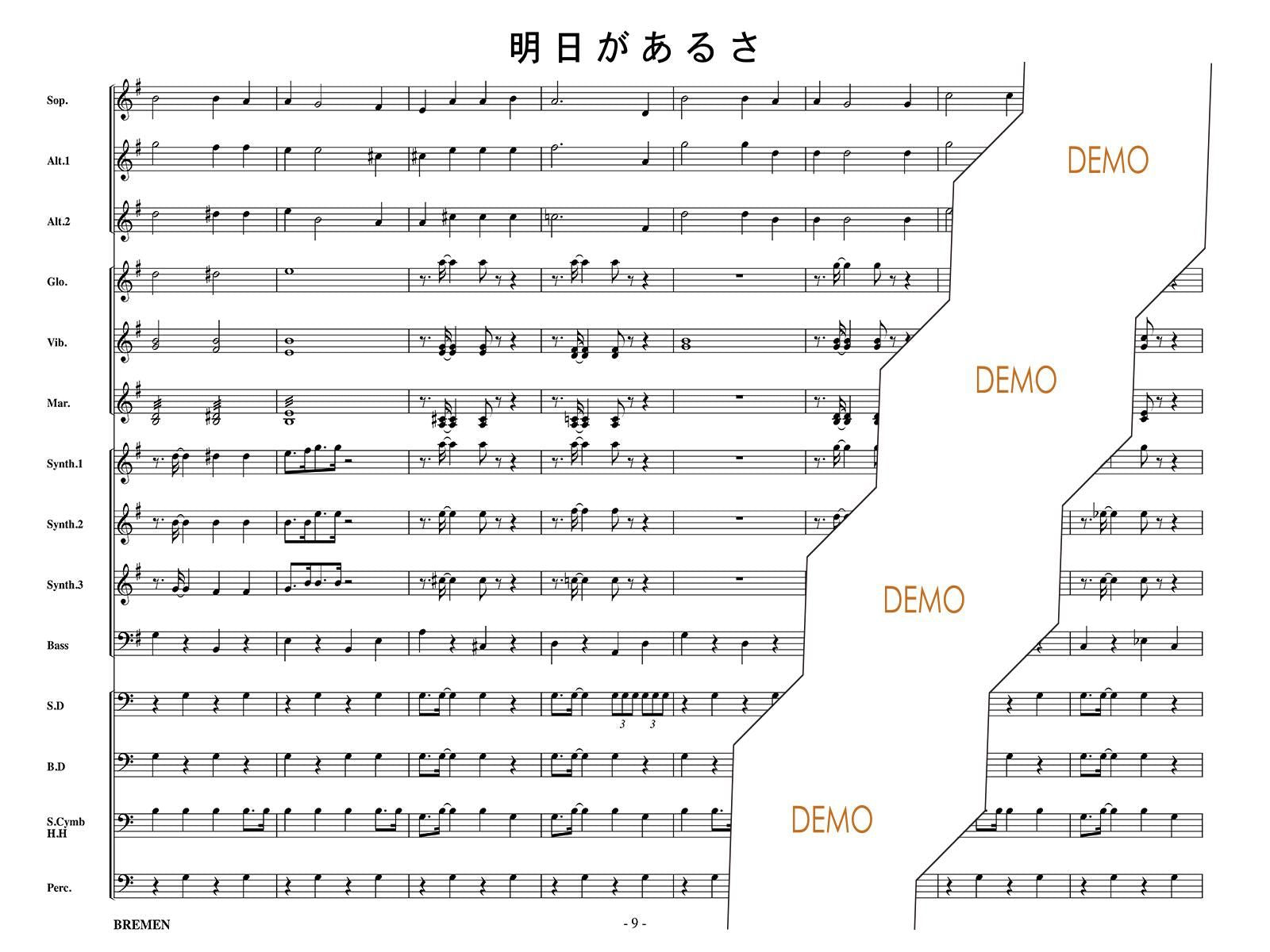 主な使用楽器:鍵盤ハーモニカ、グロッケン(鉄琴)、ビブラフォーン(鉄琴)、マリンバ(木琴)、シンセサイザー(電子オルガン)、ベース(低音楽器)、スネアドラム(小太鼓)、バスドラム(大太鼓)、パーカッション、ティンパニー等