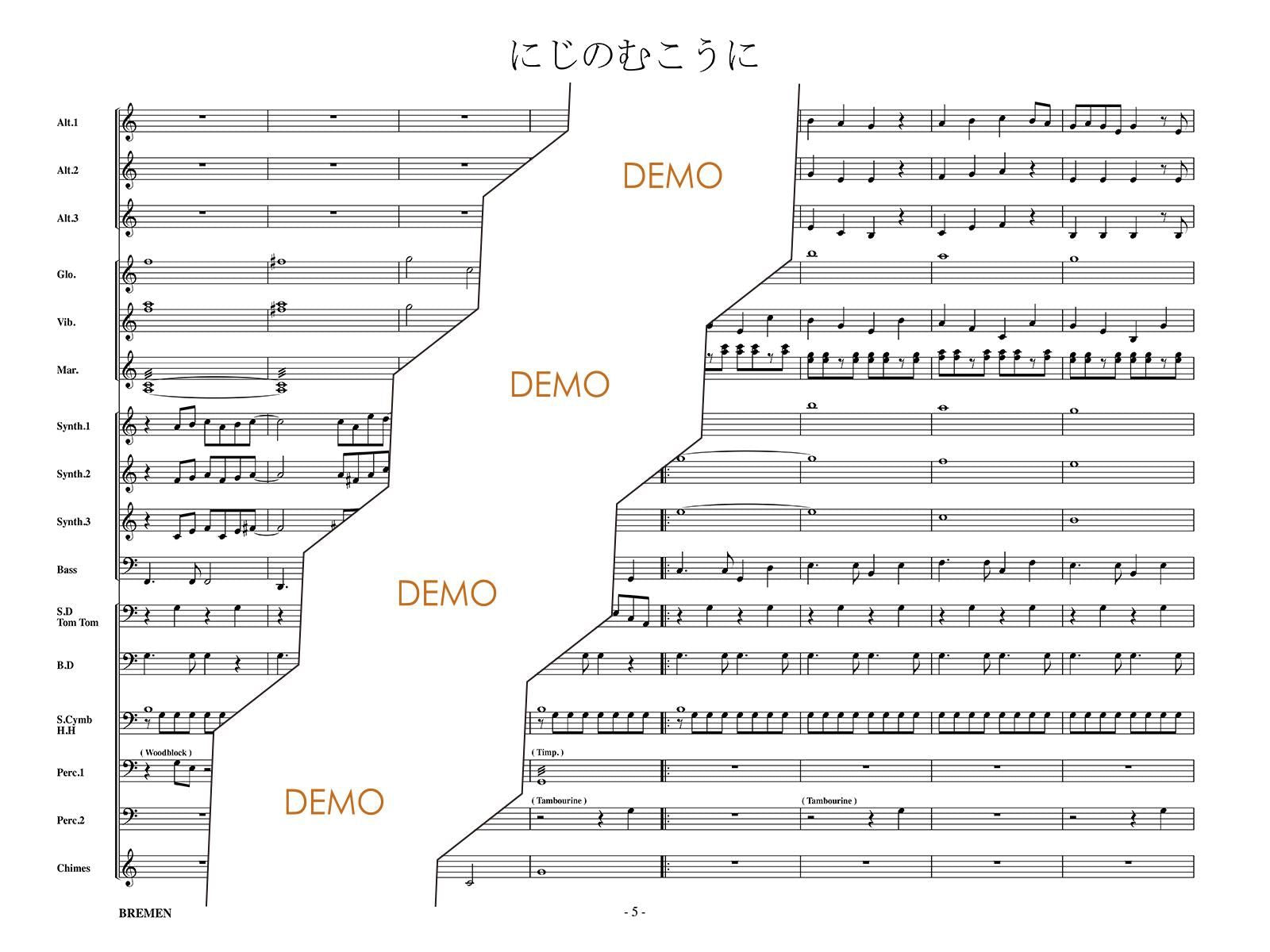 主な使用楽器:鍵盤ハーモニカ、グロッケン(鉄琴)、ビブラフォーン(鉄琴)、マリンバ(木琴)、シンセサイザー(電子オルガン)、ベース(低音楽器)、スネアドラム(小太鼓)、バスドラム(大太鼓)、パーカッション、ティンパニー等
