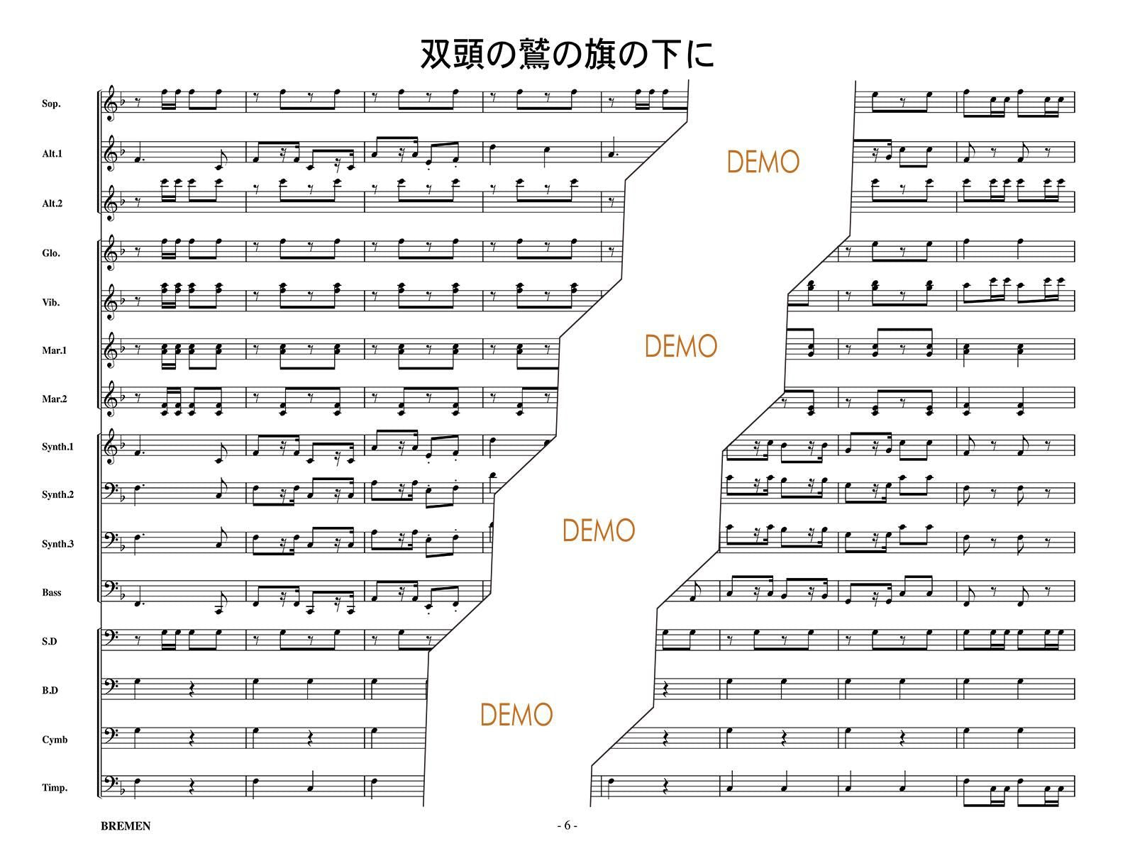 主な使用楽器:鍵盤ハーモニカ、グロッケン(鉄琴)、ビブラフォーン(鉄琴)、マリンバ(木琴)、シンセサイザー(電子オルガン)、ベース(低音楽器)、スネアドラム(小太鼓)、バスドラム(大太鼓)、パーカッション、ティンパニー等