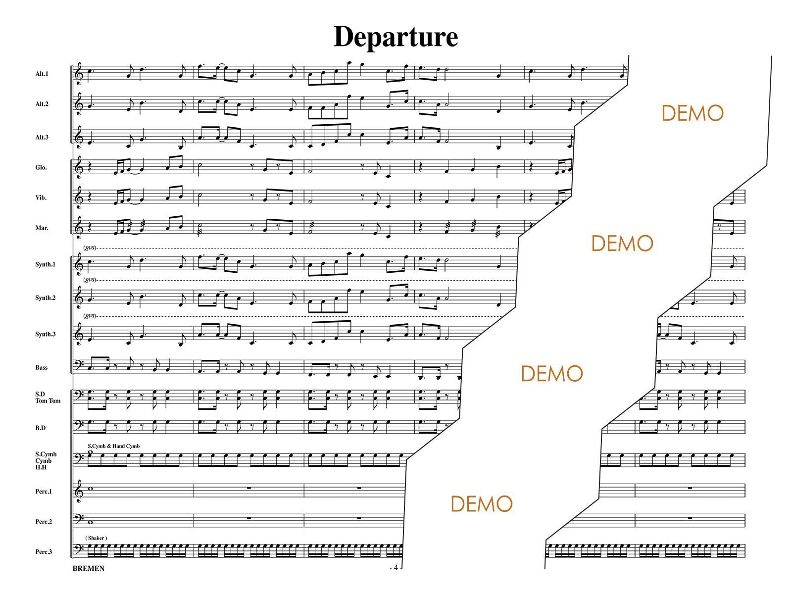 主な使用楽器:鍵盤ハーモニカ、グロッケン(鉄琴)、ビブラフォーン(鉄琴)、マリンバ(木琴)、シンセサイザー(電子オルガン)、ベース(低音楽器)、スネアドラム(小太鼓)、バスドラム(大太鼓)、パーカッション、ティンパニー等