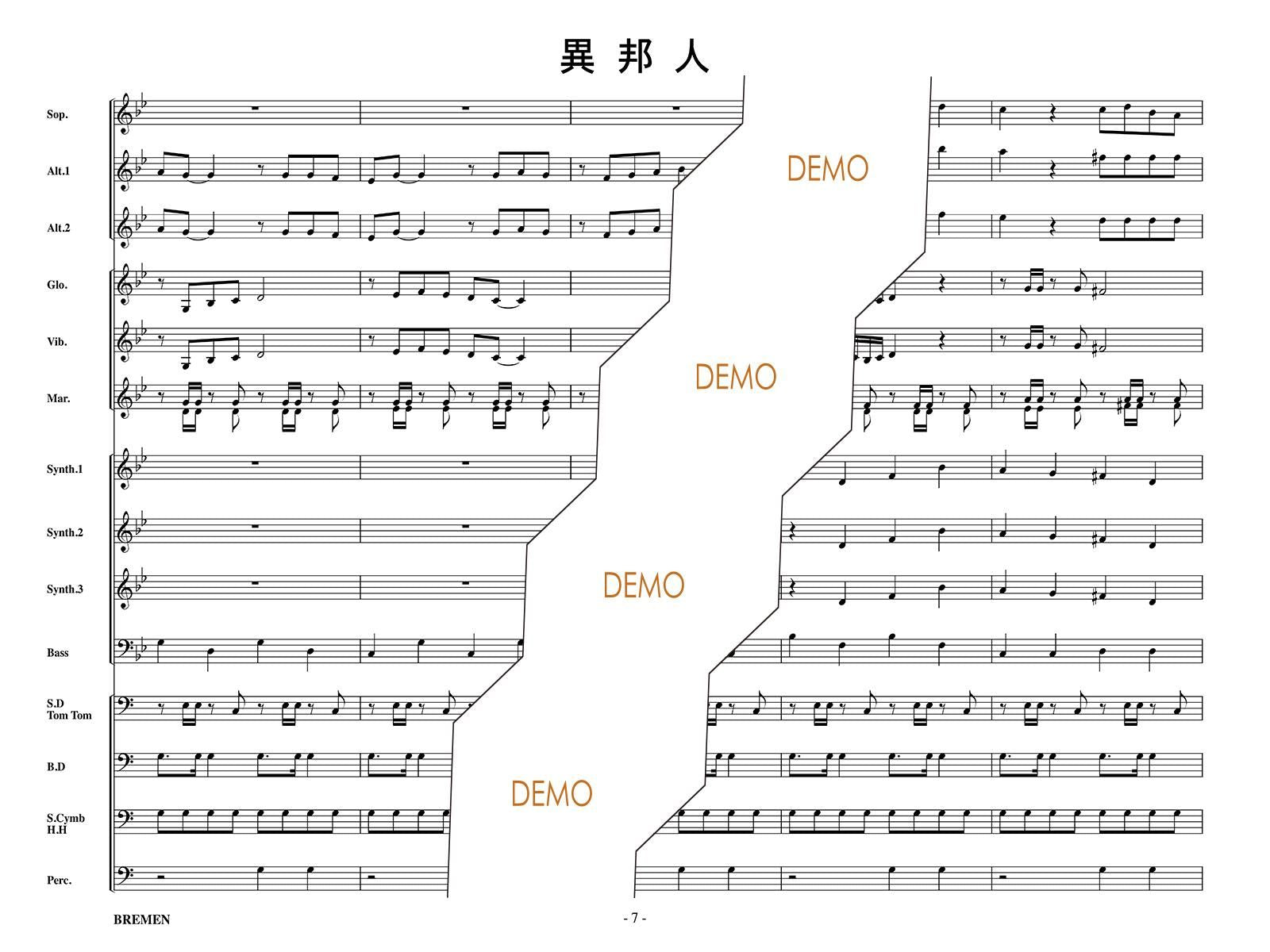 主な使用楽器:鍵盤ハーモニカ、グロッケン(鉄琴)、ビブラフォーン(鉄琴)、マリンバ(木琴)、シンセサイザー(電子オルガン)、ベース(低音楽器)、スネアドラム(小太鼓)、バスドラム(大太鼓)、パーカッション、ティンパニー等