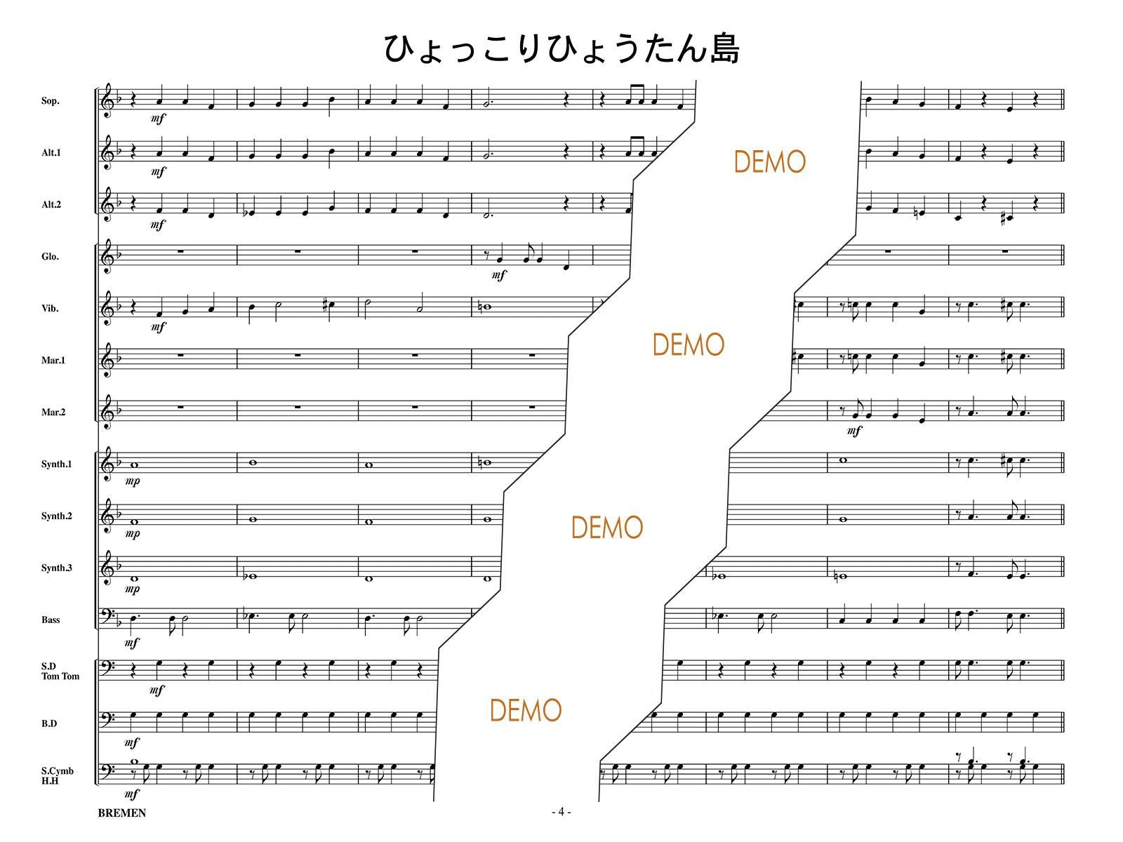 主な使用楽器:鍵盤ハーモニカ、グロッケン(鉄琴)、ビブラフォーン(鉄琴)、マリンバ(木琴)、シンセサイザー(電子オルガン)、ベース(低音楽器)、スネアドラム(小太鼓)、バスドラム(大太鼓)、パーカッション、ティンパニー等