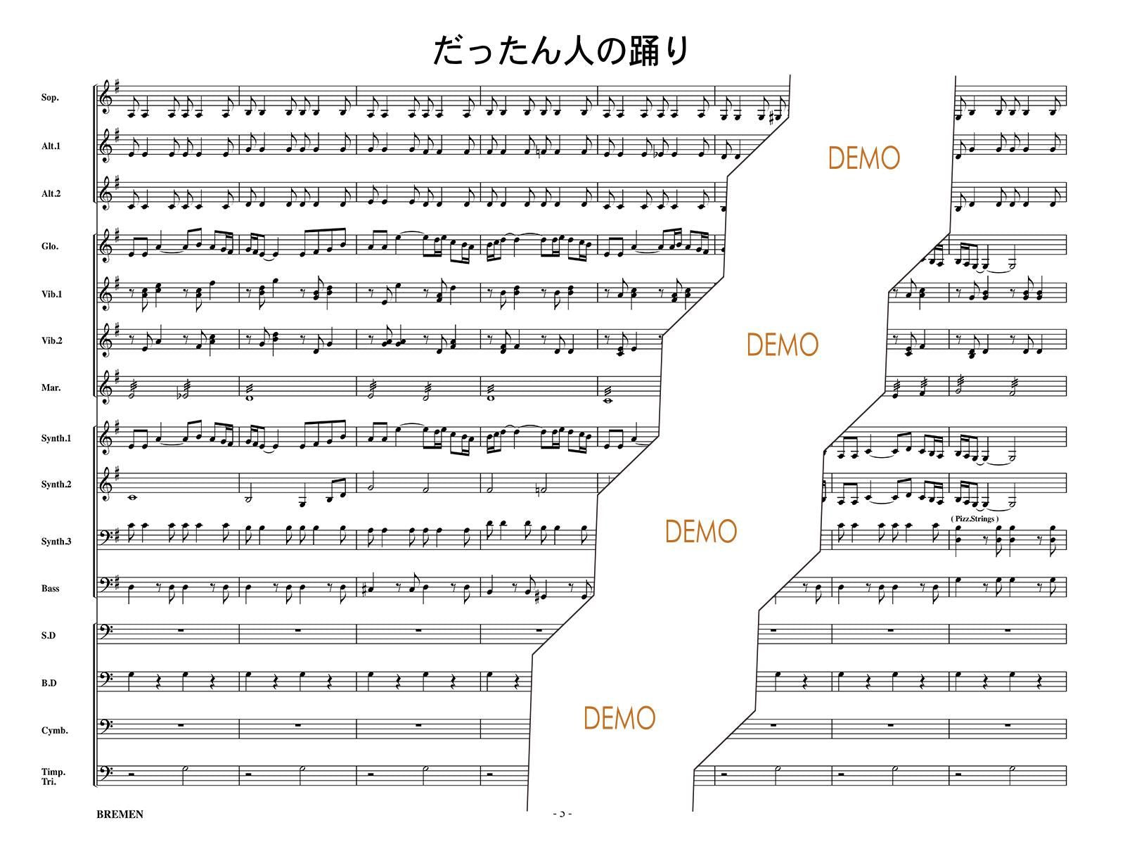 主な使用楽器:鍵盤ハーモニカ、グロッケン(鉄琴)、ビブラフォーン(鉄琴)、マリンバ(木琴)、シンセサイザー(電子オルガン)、ベース(低音楽器)、スネアドラム(小太鼓)、バスドラム(大太鼓)、パーカッション、ティンパニー等