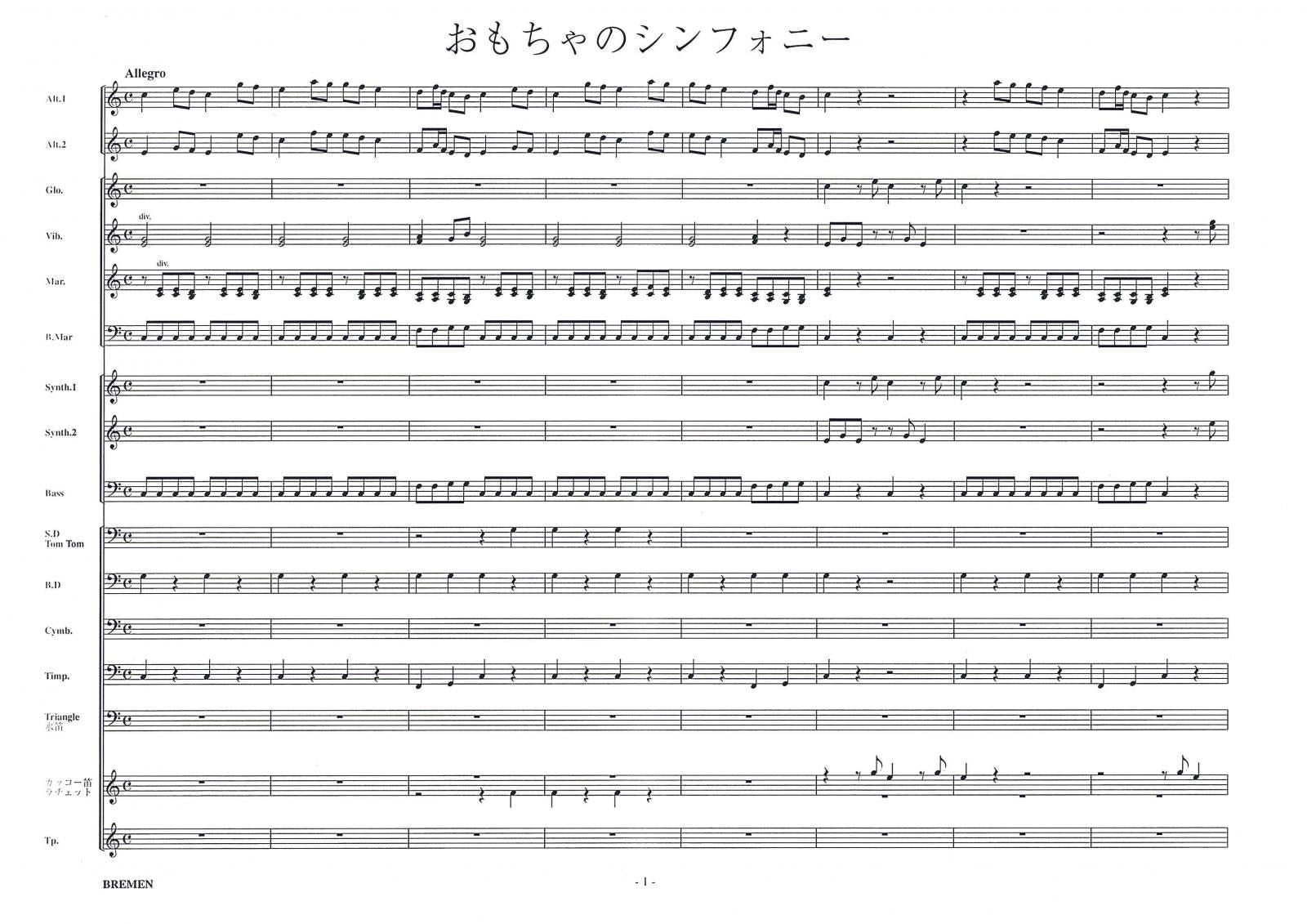 主な使用楽器:鍵盤ハーモニカ、グロッケン(鉄琴)、ビブラフォーン(鉄琴)、マリンバ(木琴)、シンセサイザー(電子オルガン)、ベース(低音楽器)、スネアドラム(小太鼓)、バスドラム(大太鼓)、パーカッション、ティンパニー等