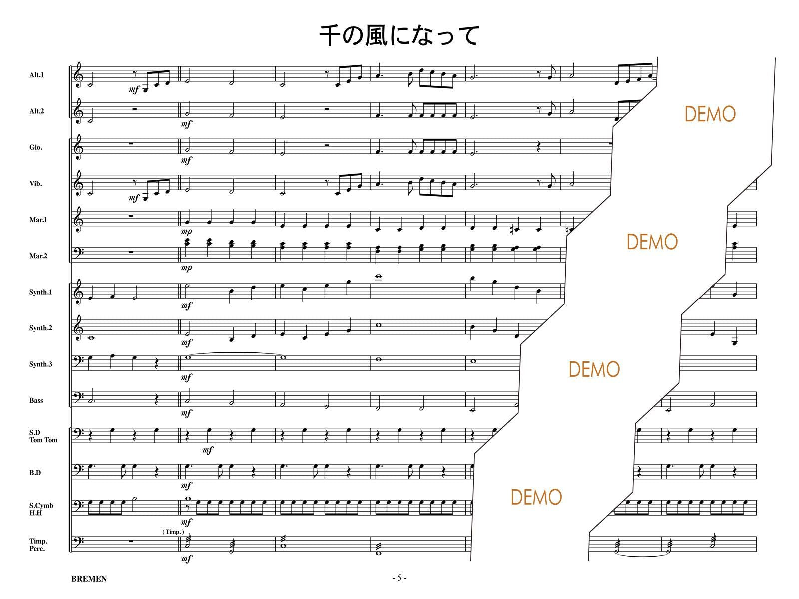 主な使用楽器:鍵盤ハーモニカ、グロッケン(鉄琴)、ビブラフォーン(鉄琴)、マリンバ(木琴)、シンセサイザー(電子オルガン)、ベース(低音楽器)、スネアドラム(小太鼓)、バスドラム(大太鼓)、パーカッション、ティンパニー等