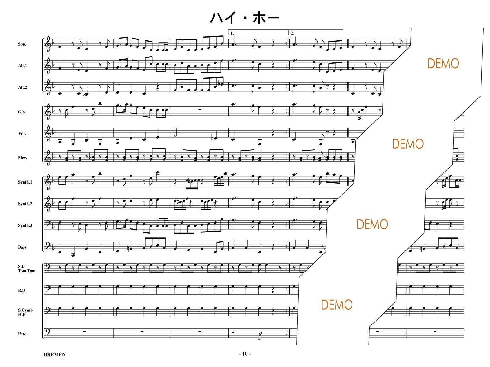 主な使用楽器:鍵盤ハーモニカ、グロッケン(鉄琴)、ビブラフォーン(鉄琴)、マリンバ(木琴)、シンセサイザー(電子オルガン)、ベース(低音楽器)、スネアドラム(小太鼓)、バスドラム(大太鼓)、パーカッション、ティンパニー等